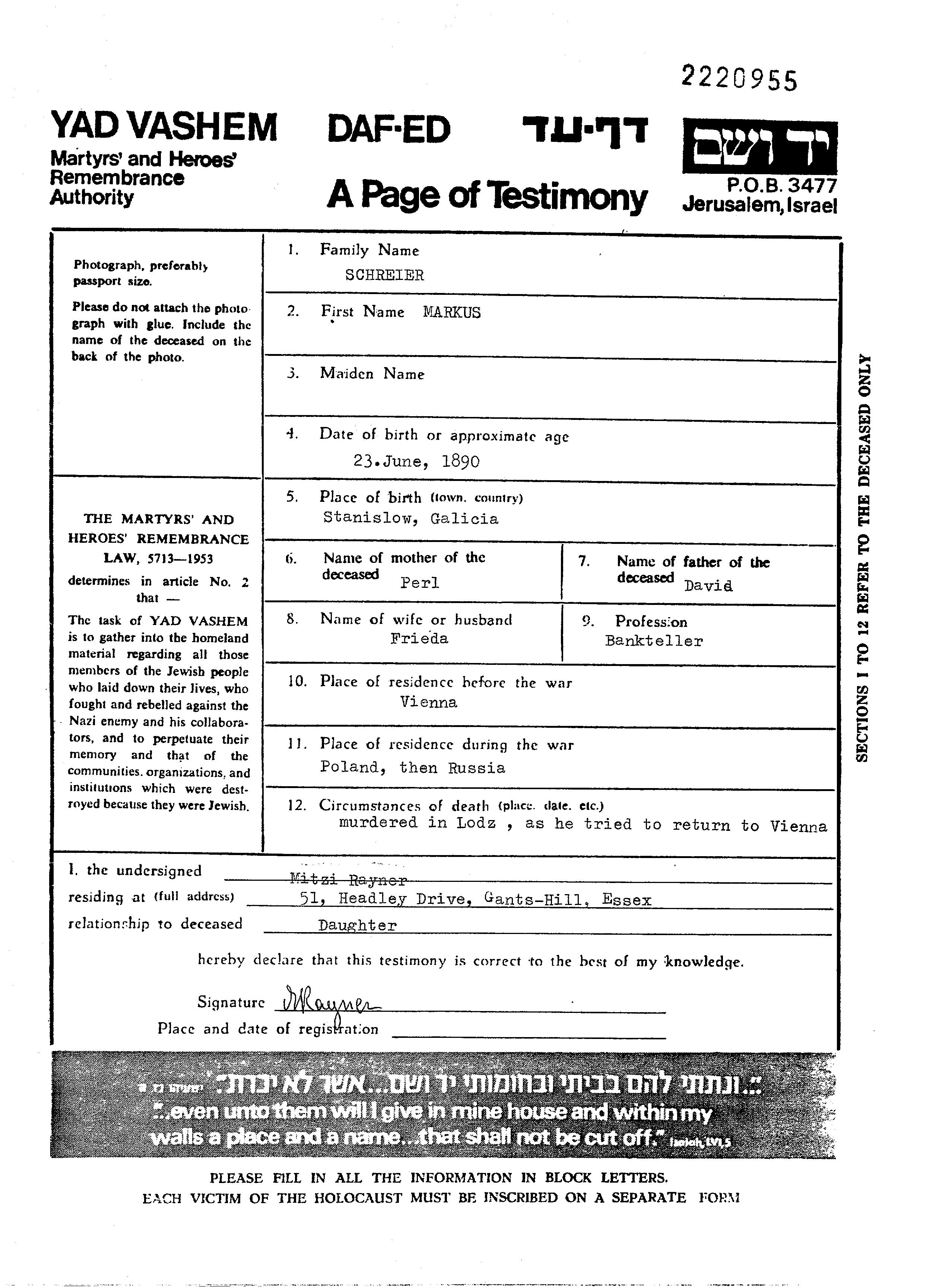 Schreier | Markus | 1890 | Wien, Autriche | Feuille de témoignage |