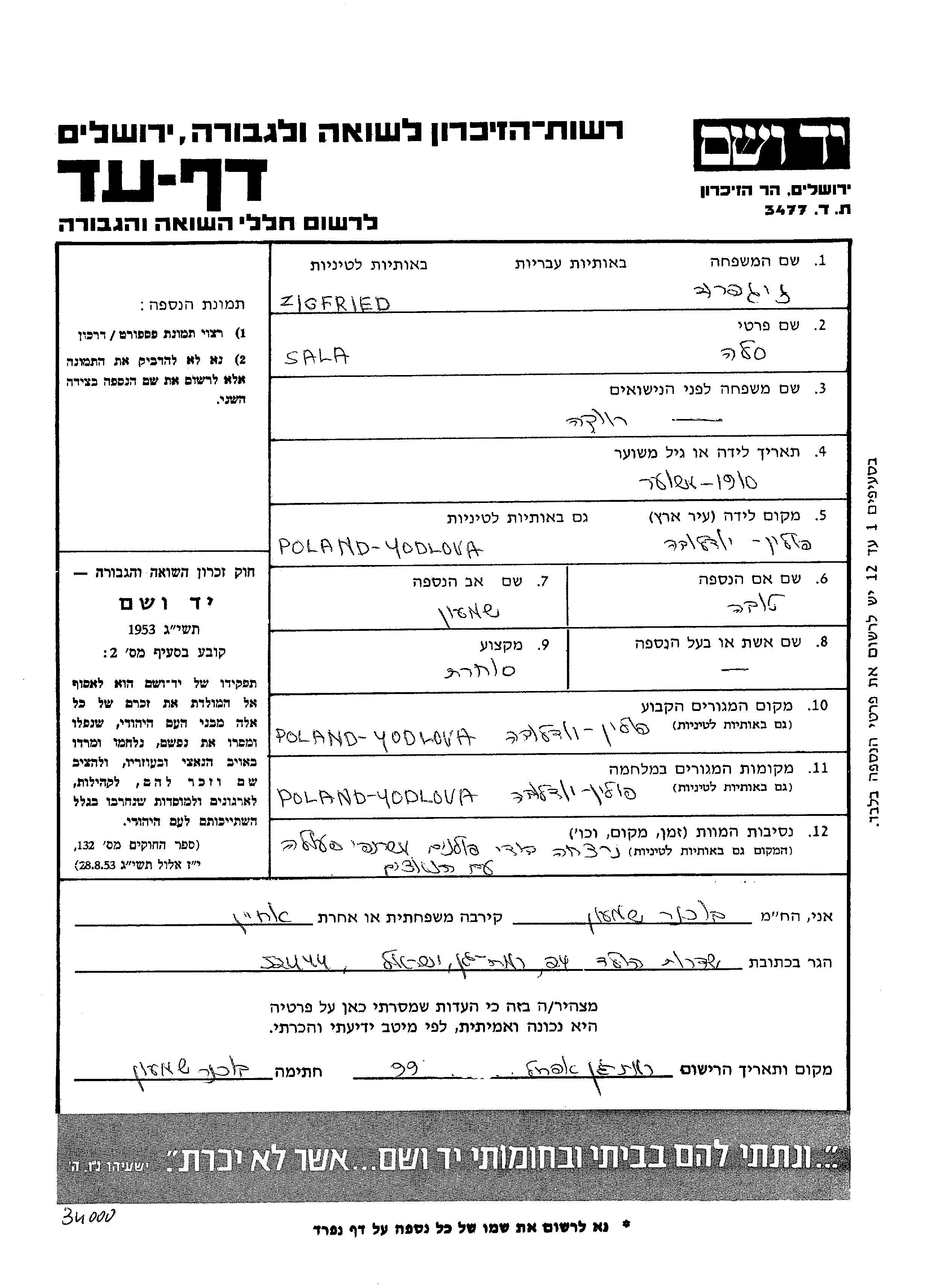 Zigfried Sala 1910 Yodlava, Pologne Feuille de témoignage