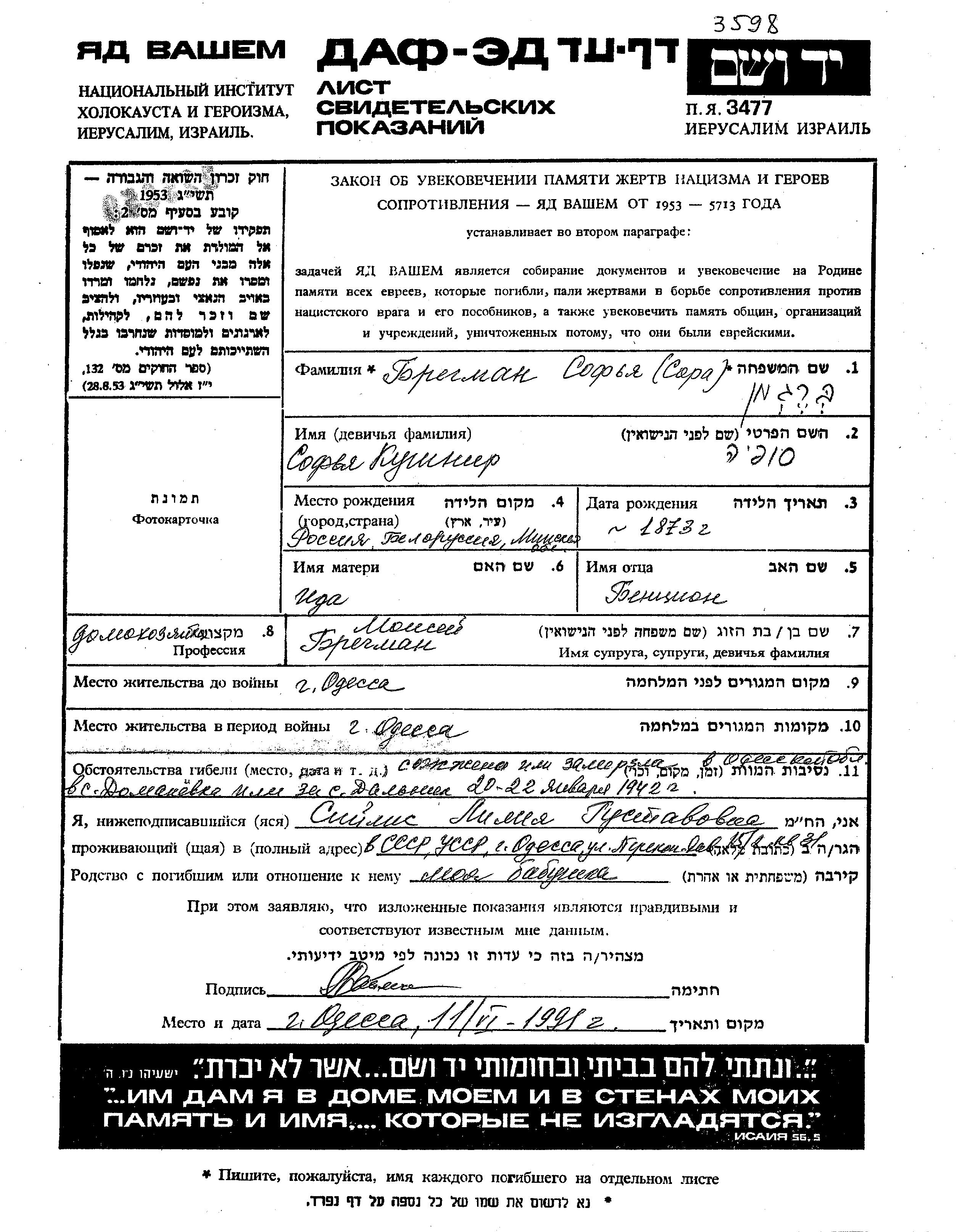 Bregman Bergman Sora Sofia 1873 Odessa, Ukraine (URSS) Feuille de témoignage
