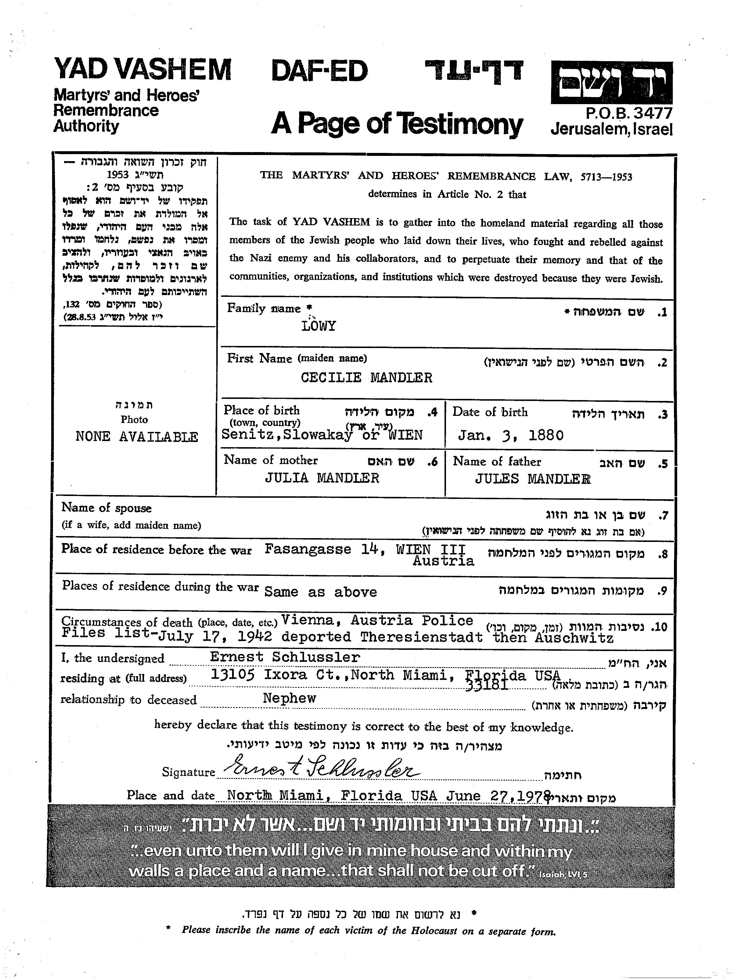 Cecilie Loewy née Mandler est née à Wien, Autriche en 1880. Avant la seconde guerre mondiale elle vivait à Wien, Autriche.