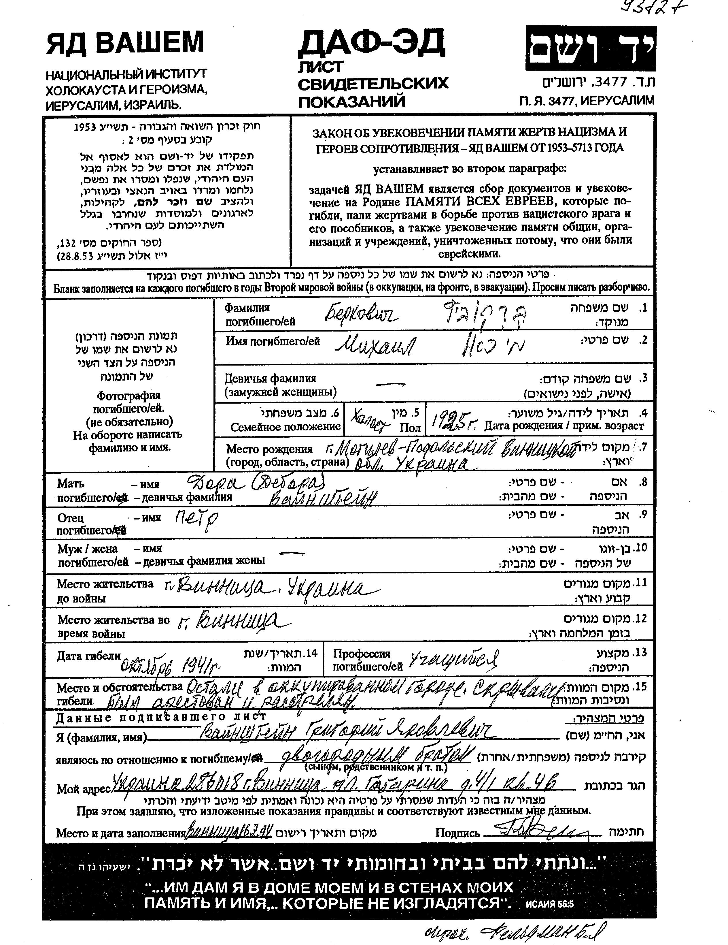 Berkovich | Mikhail | 1925 | Vinnitsa, Ukraine (URSS) | Feuille de témoignage |
