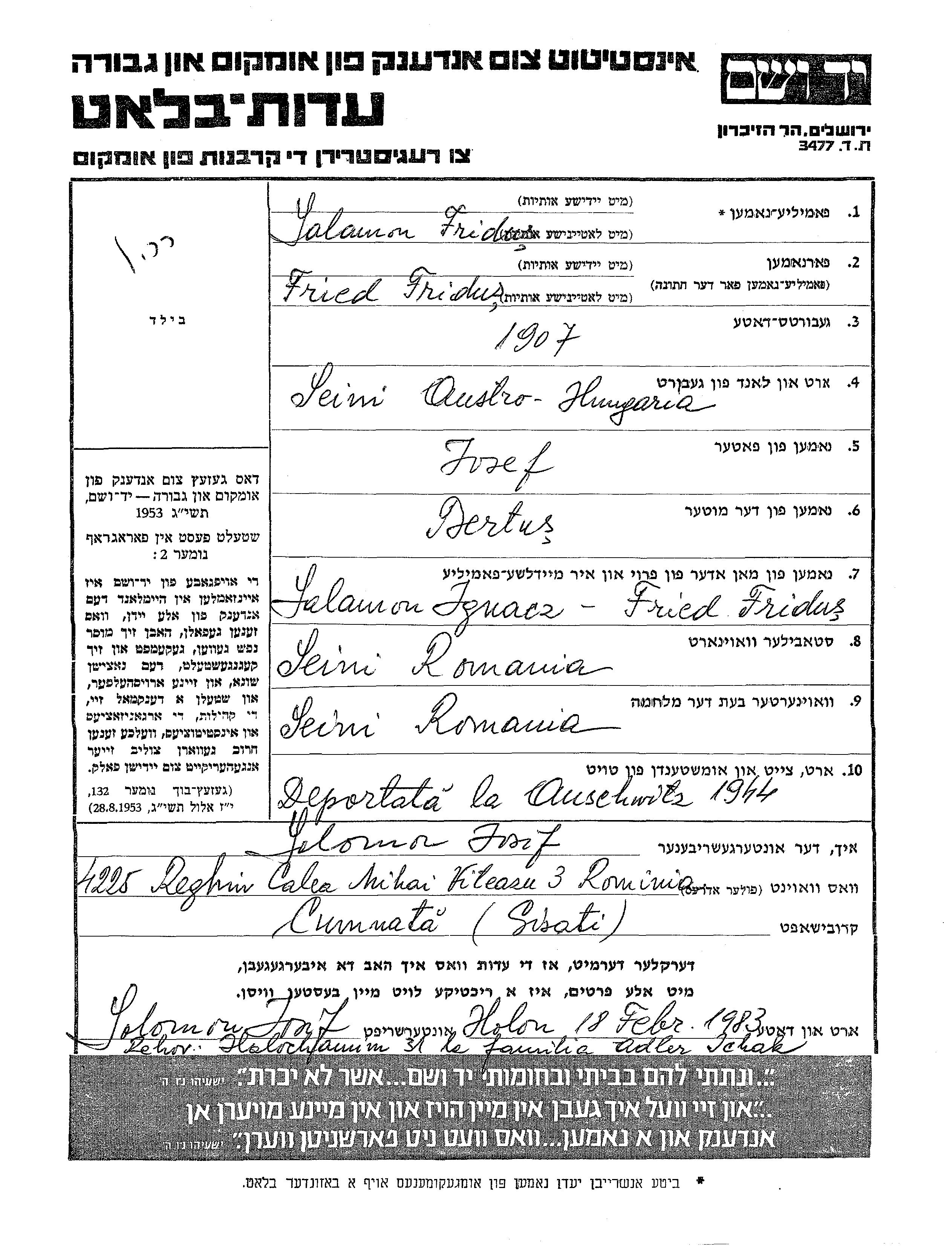 Salamon Fridus 1907 Seini, Roumanie Feuille de témoignage