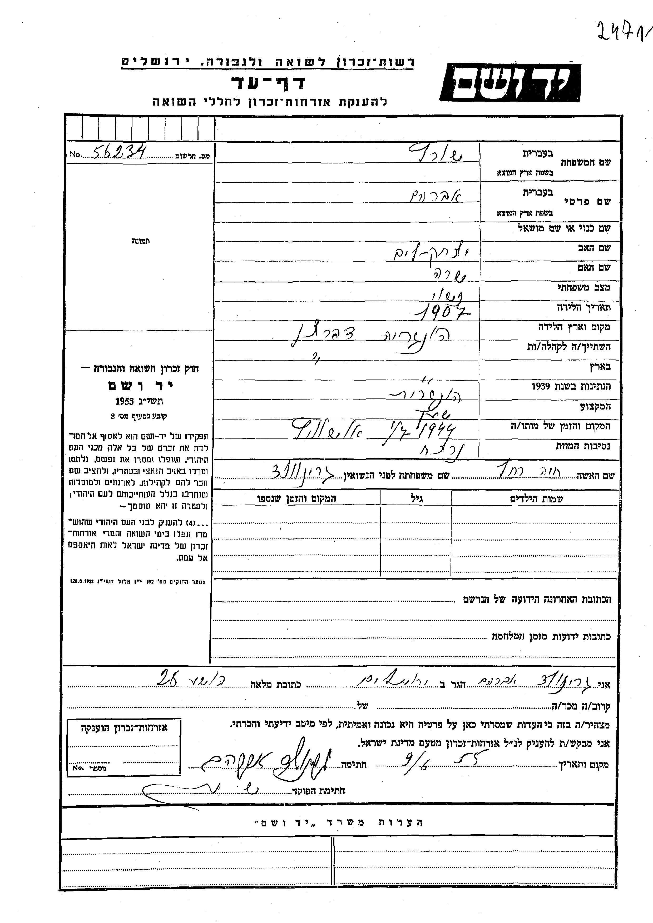Shvartz Avraham 1907 endroit inconnu, Feuille de témoignage