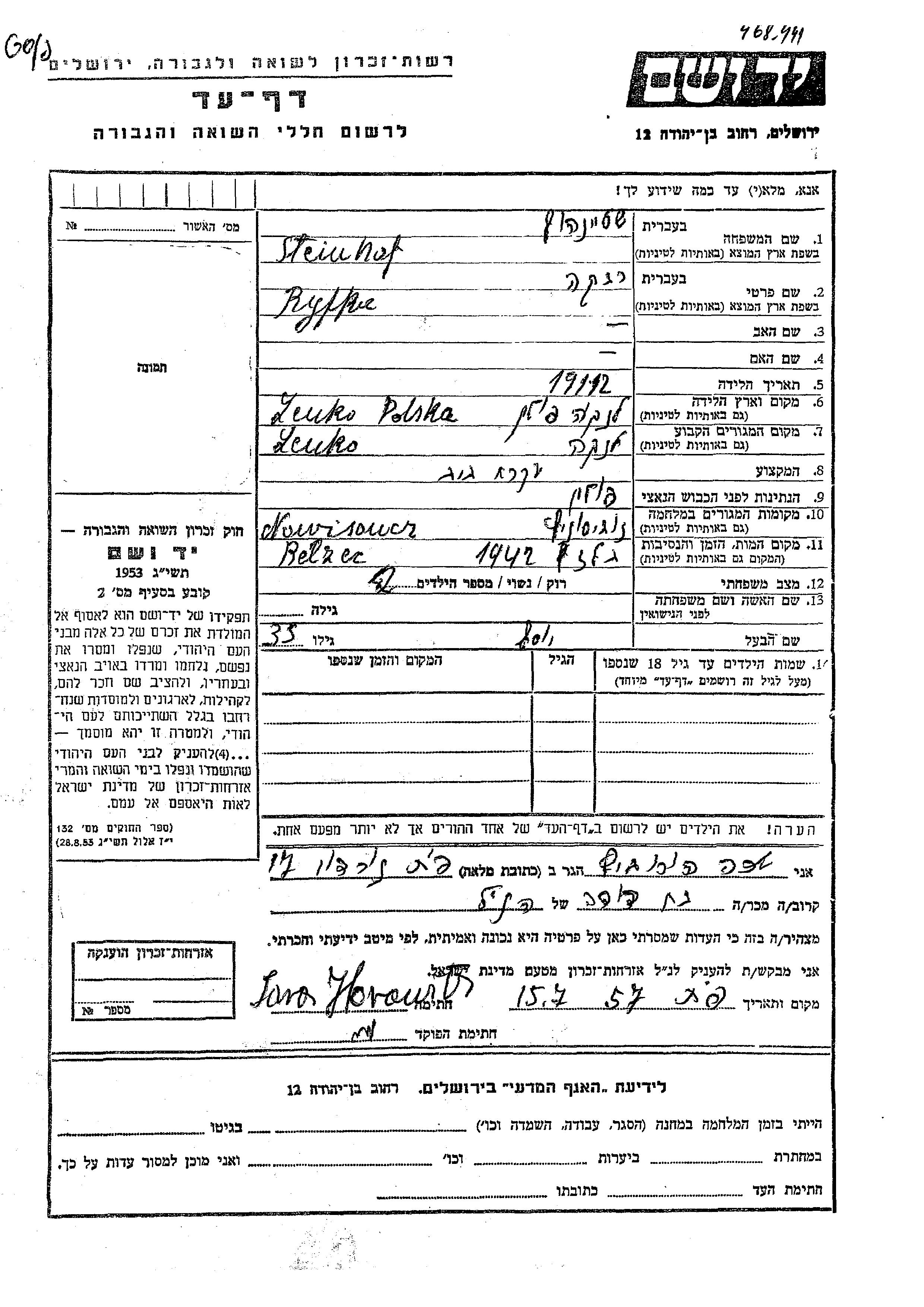 Ryfka Steinhof est née à Łęka, Pologne en 1911. Elle était Femme au foyer et Mariée à Yosef. Avant la seconde guerre mondiale elle vivait à Łęka, Pologne. Pendant la guerre, elle était à Nowy Sącz, Pologne.