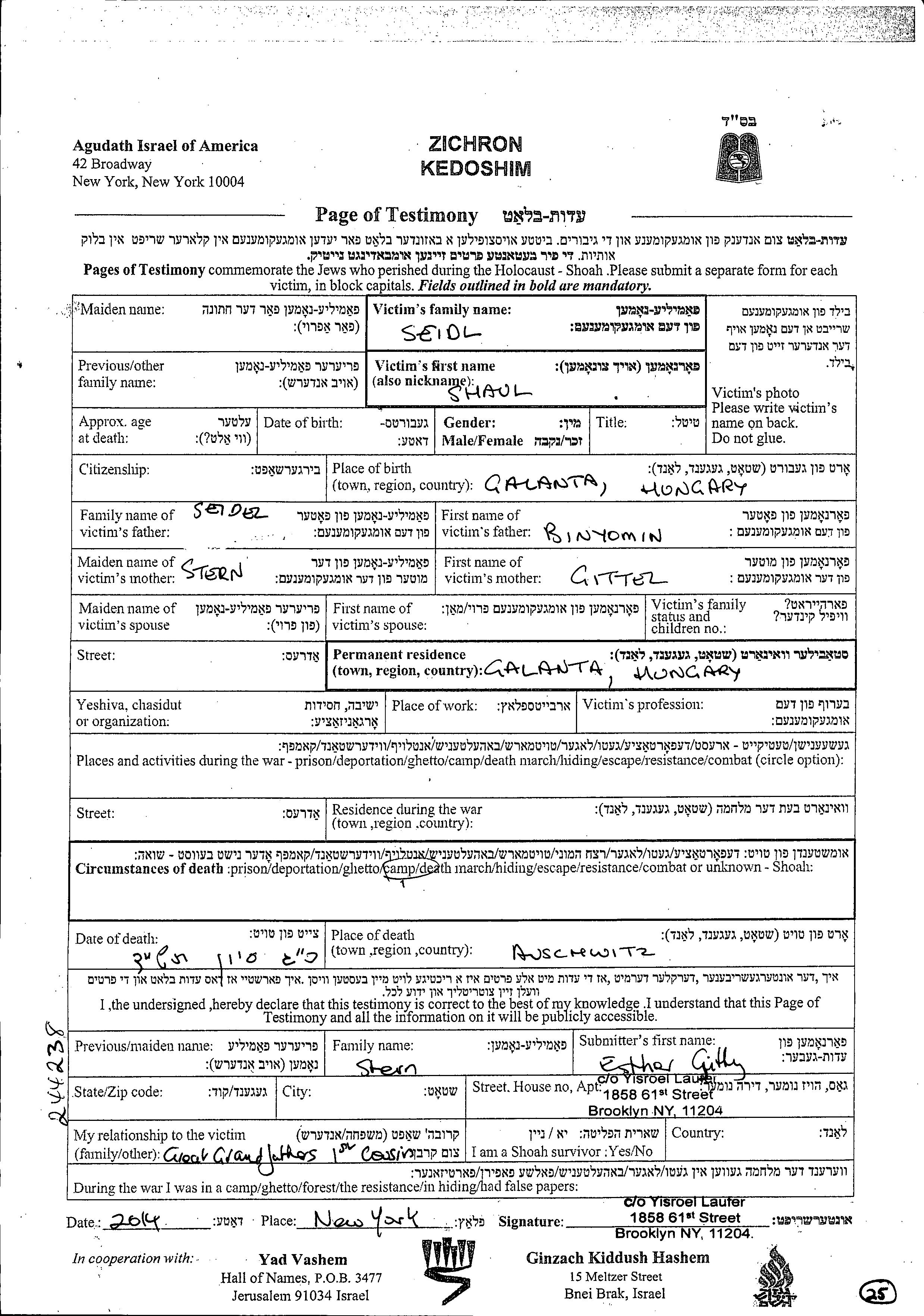 Seidl Shaul Galanta, Tchécoslovaquie Feuille de témoignage