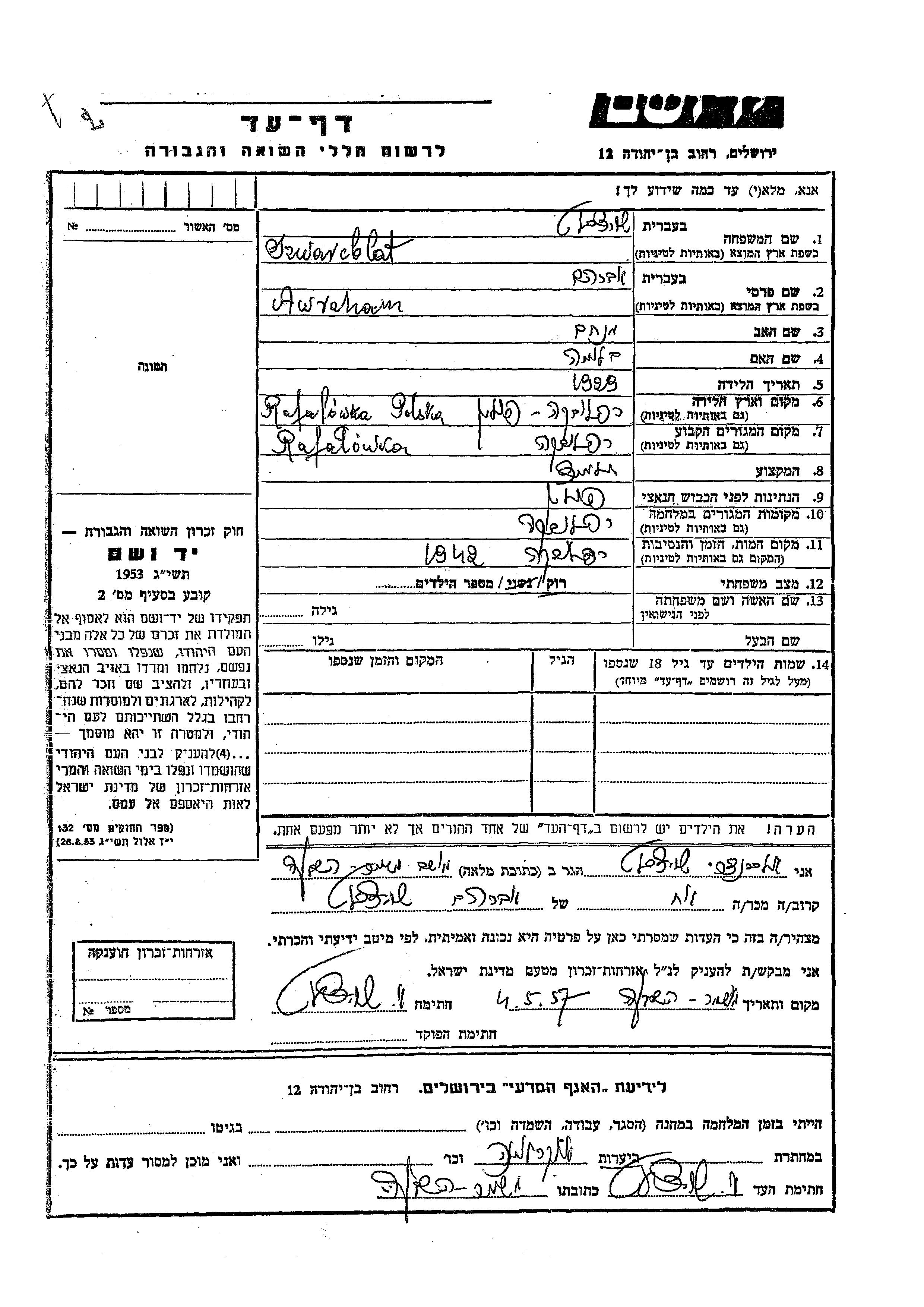 Szwarcblat | Avraham | Rafałówka, Pologne | Feuille de témoignage |