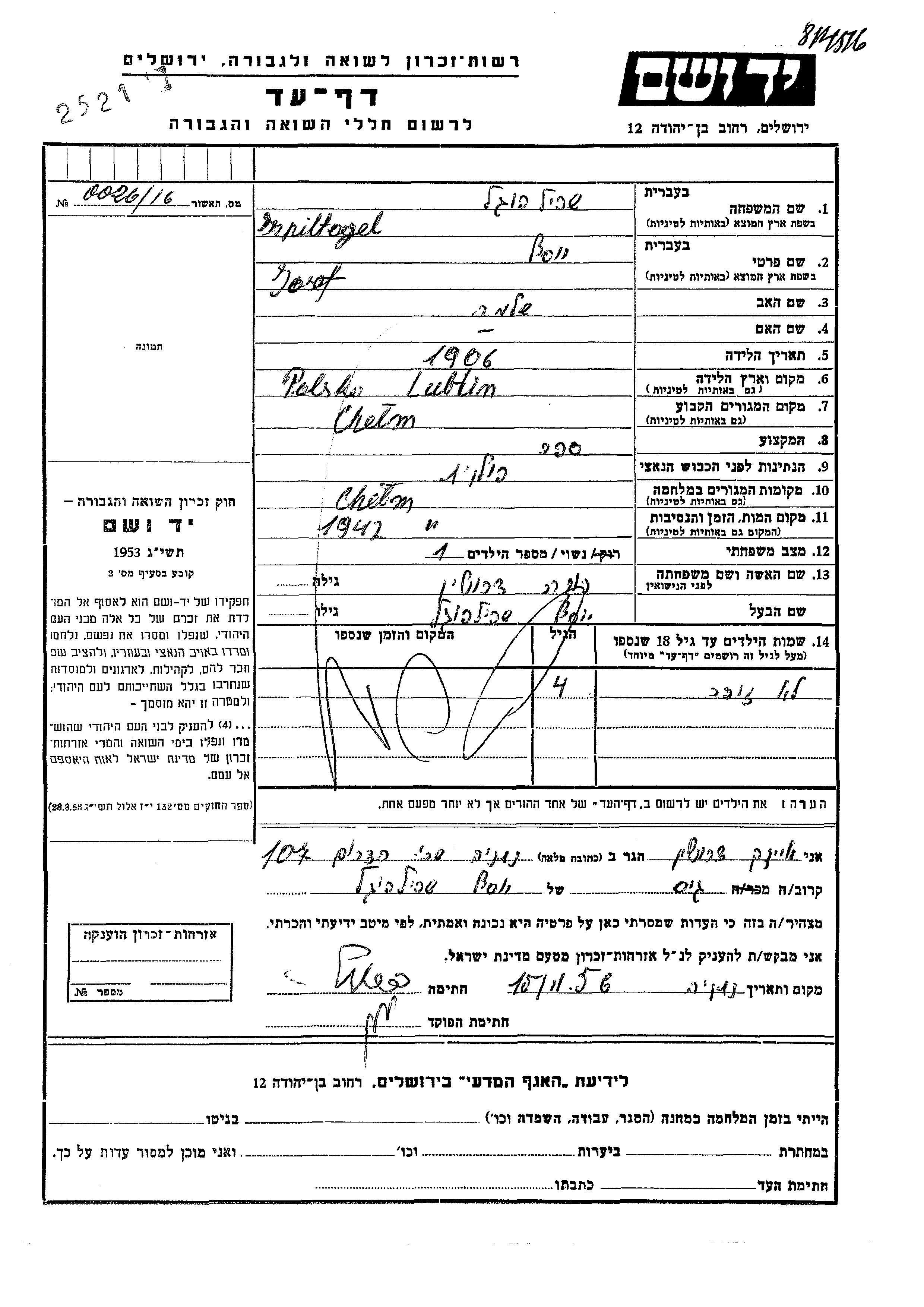 Szpilfogel Josef 1906 Chelm, Pologne Feuille de témoignage