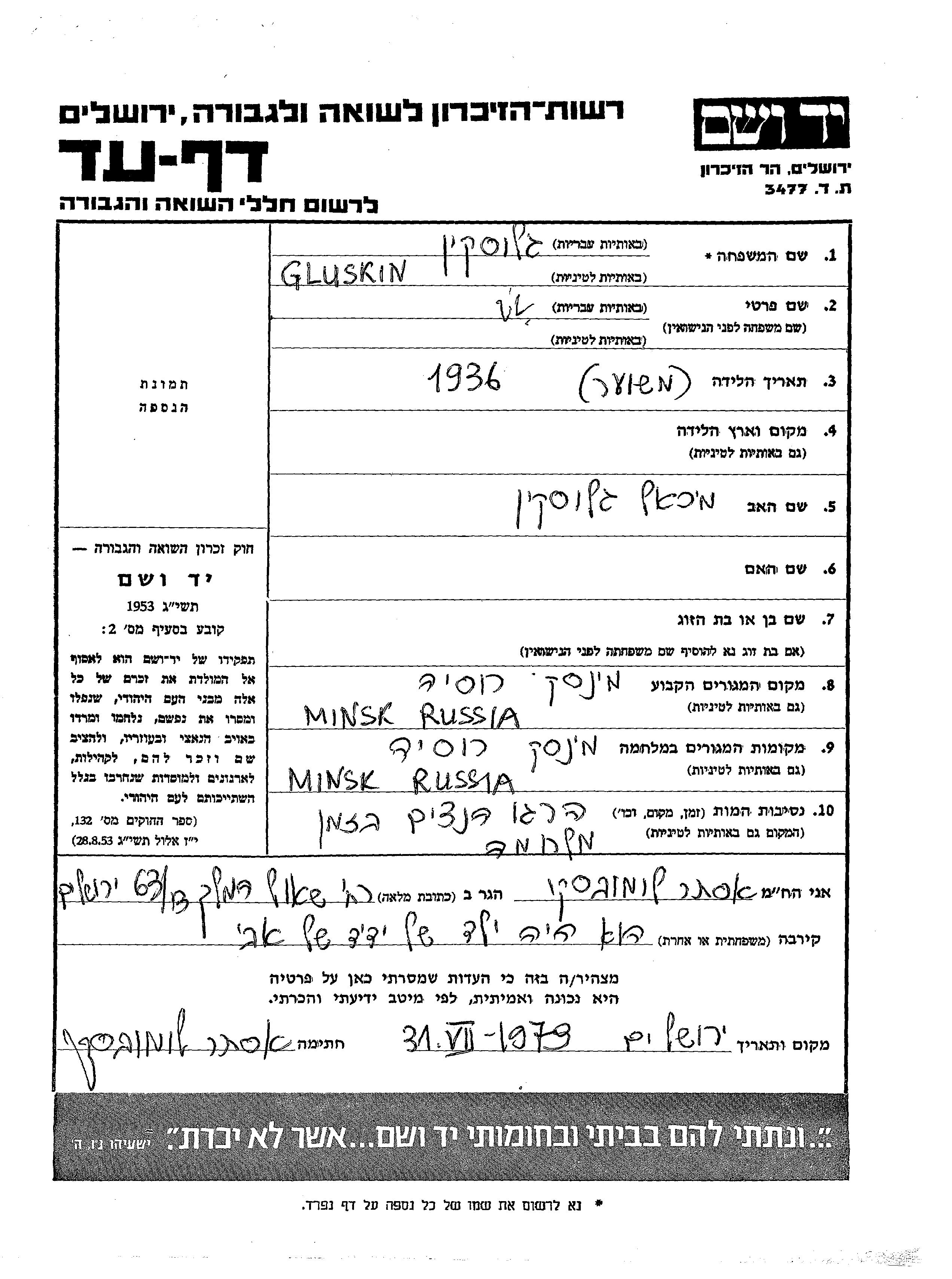 Gluskin prénom inconnu 1936 Minsk, Bélorussie (URSS) Feuille de témoignage