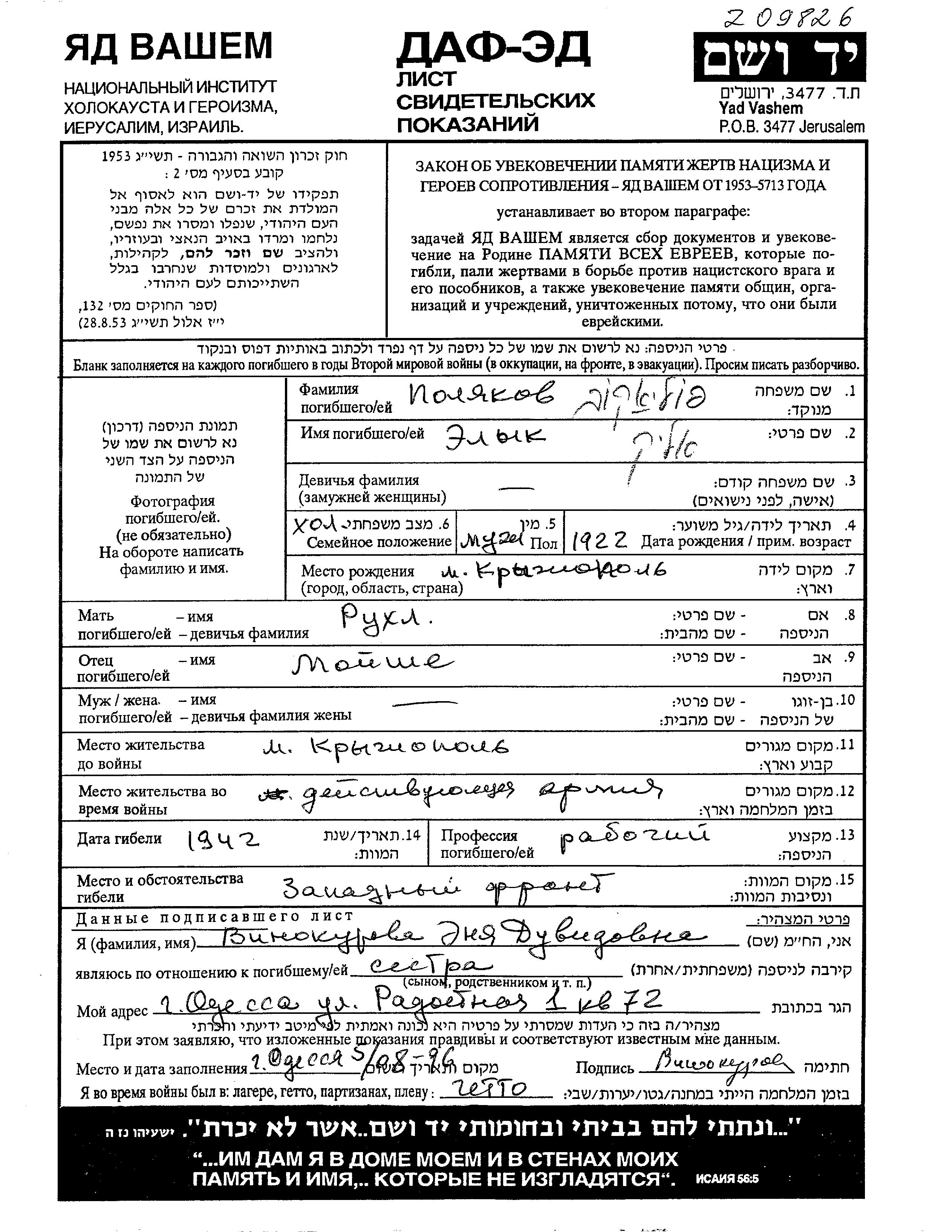 Polyakov Elyk Alik 1922 Kryzhopol, Ukraine (URSS) Feuille de témoignage