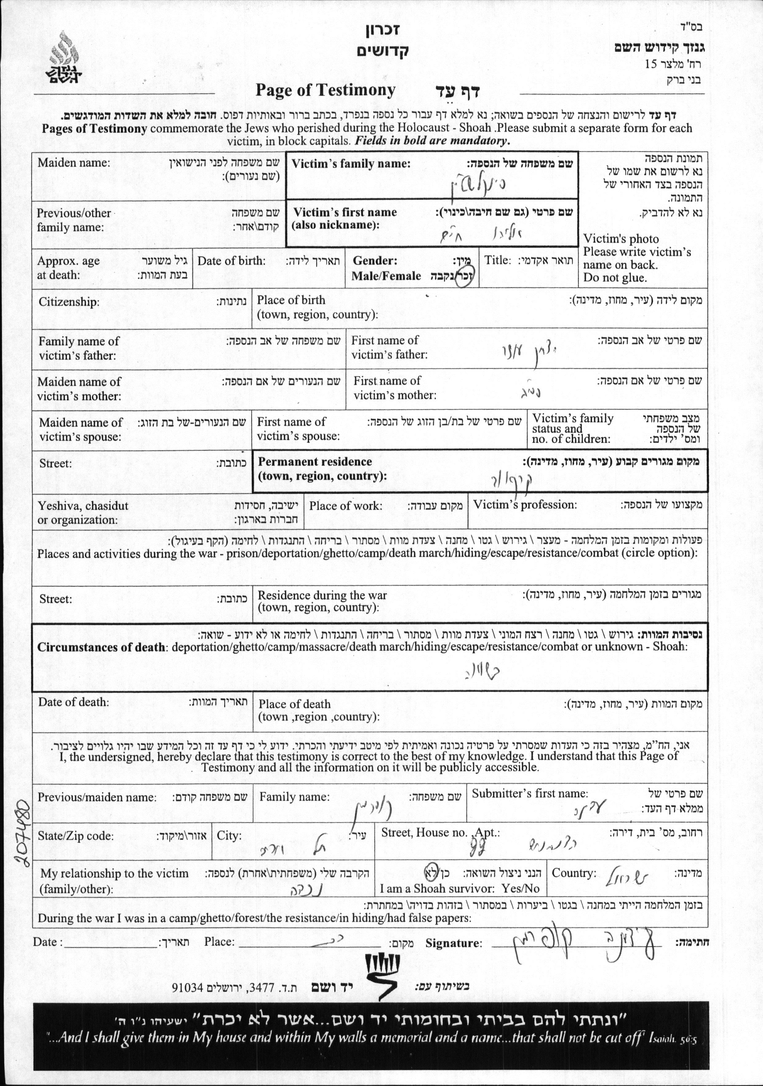 Yad Vashem - Pages of Testimony Names Memorial Collection