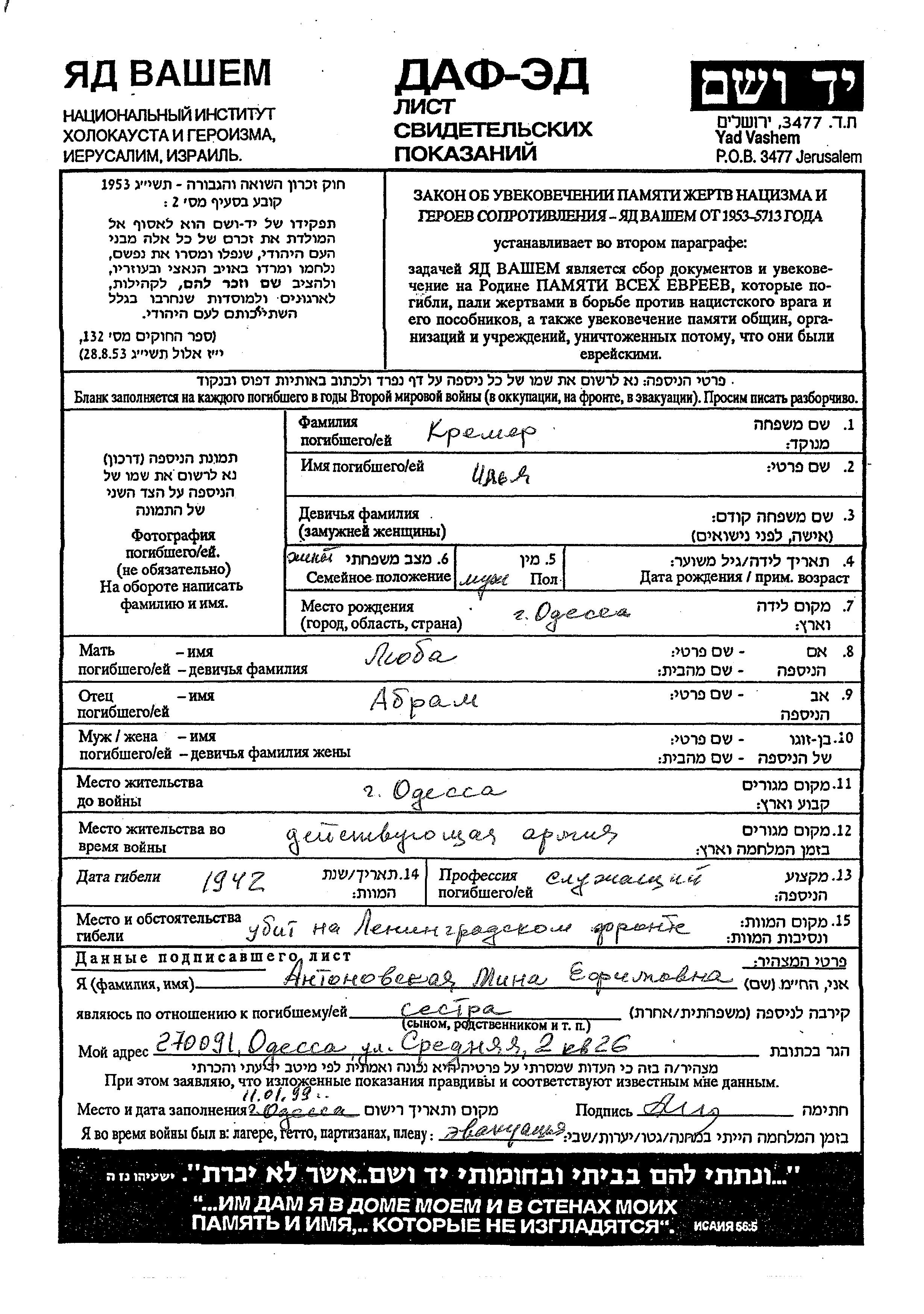 Kremer Ilya Odessa, Ukraine (URSS) Feuille de témoignage