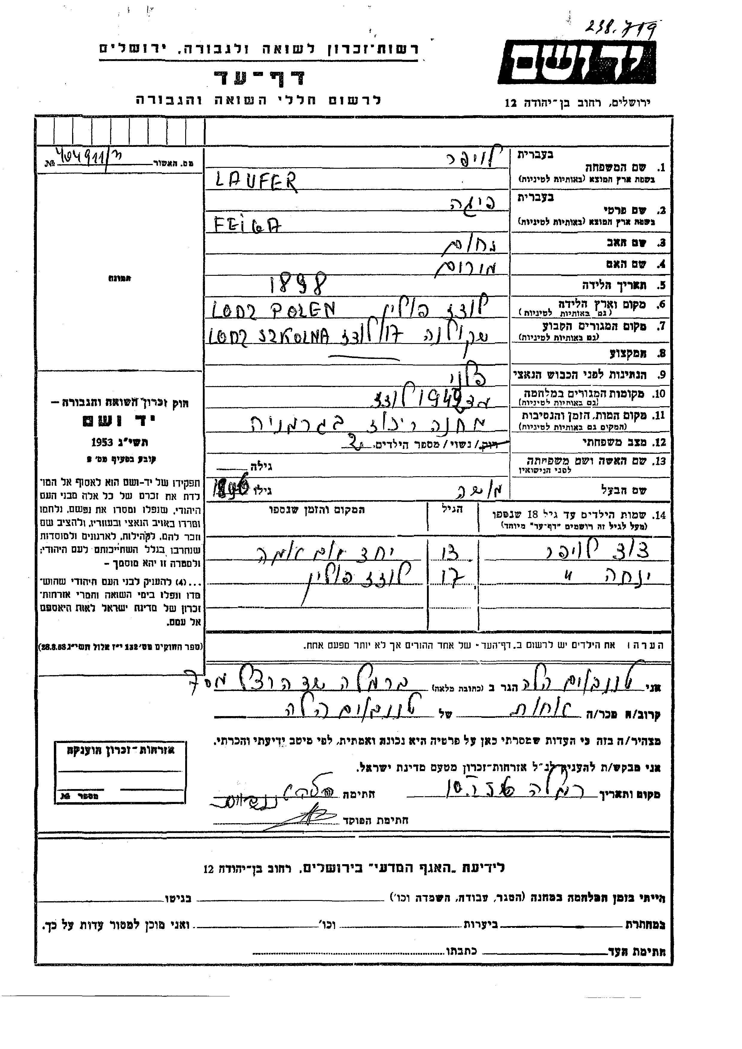 | Laufer Opper | Dawid | 1929 | Lodz, Pologne | Feuille de témoignage |