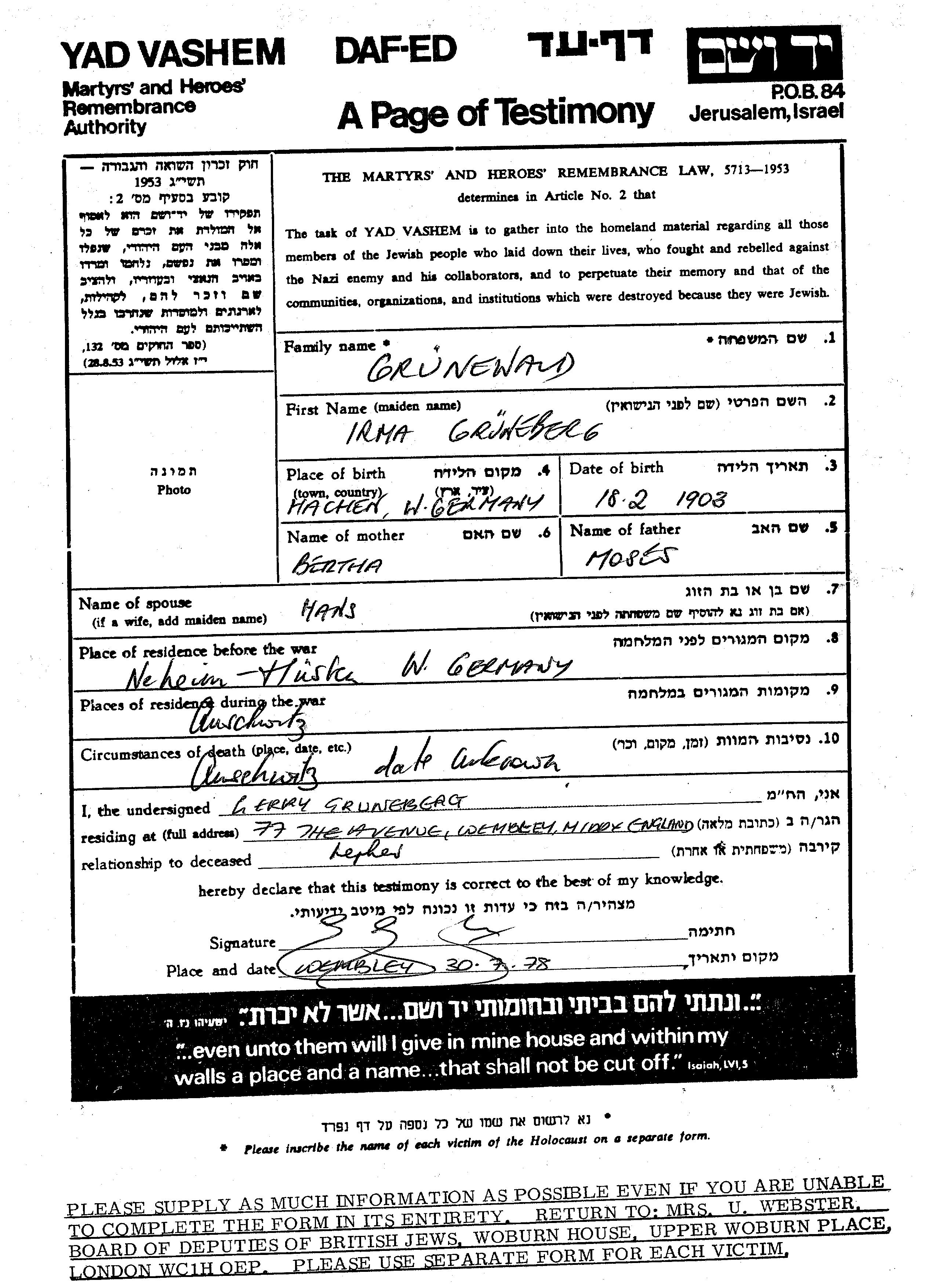 Irma Grunewald est née à Hachen, Allemagne en 1903, fille de Moses et de Bertha. Elle était Mariée à Hans. Avant la seconde guerre mondiale elle vivait à Neheim Husten, Allemagne. Pendant la guerre, elle était à Auschwitz, Pologne.