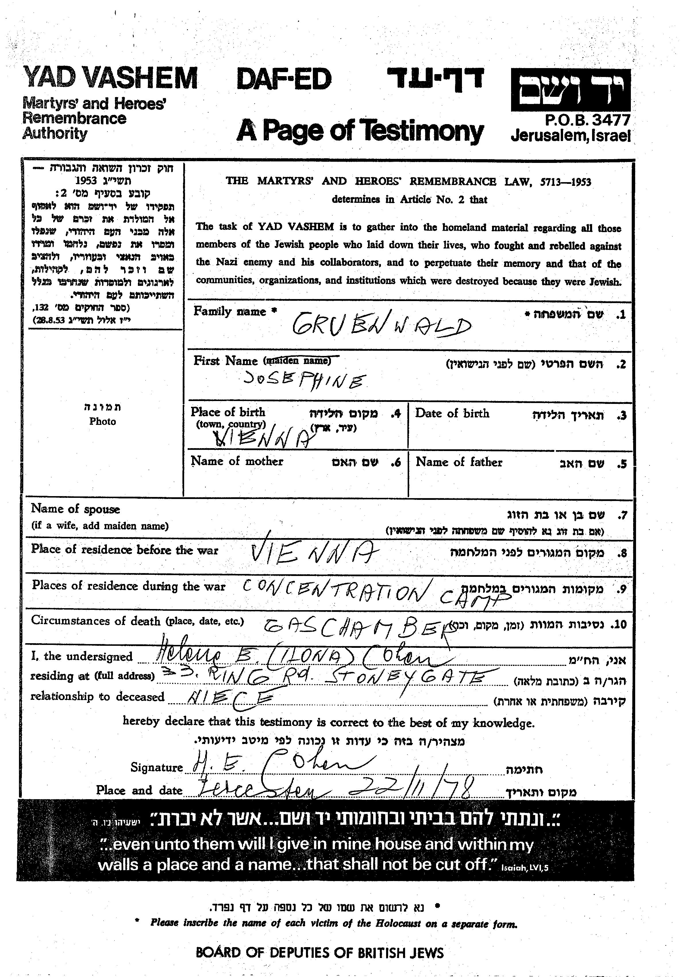 Gruenwald Josefine Vienna, Autriche Feuille de témoignage