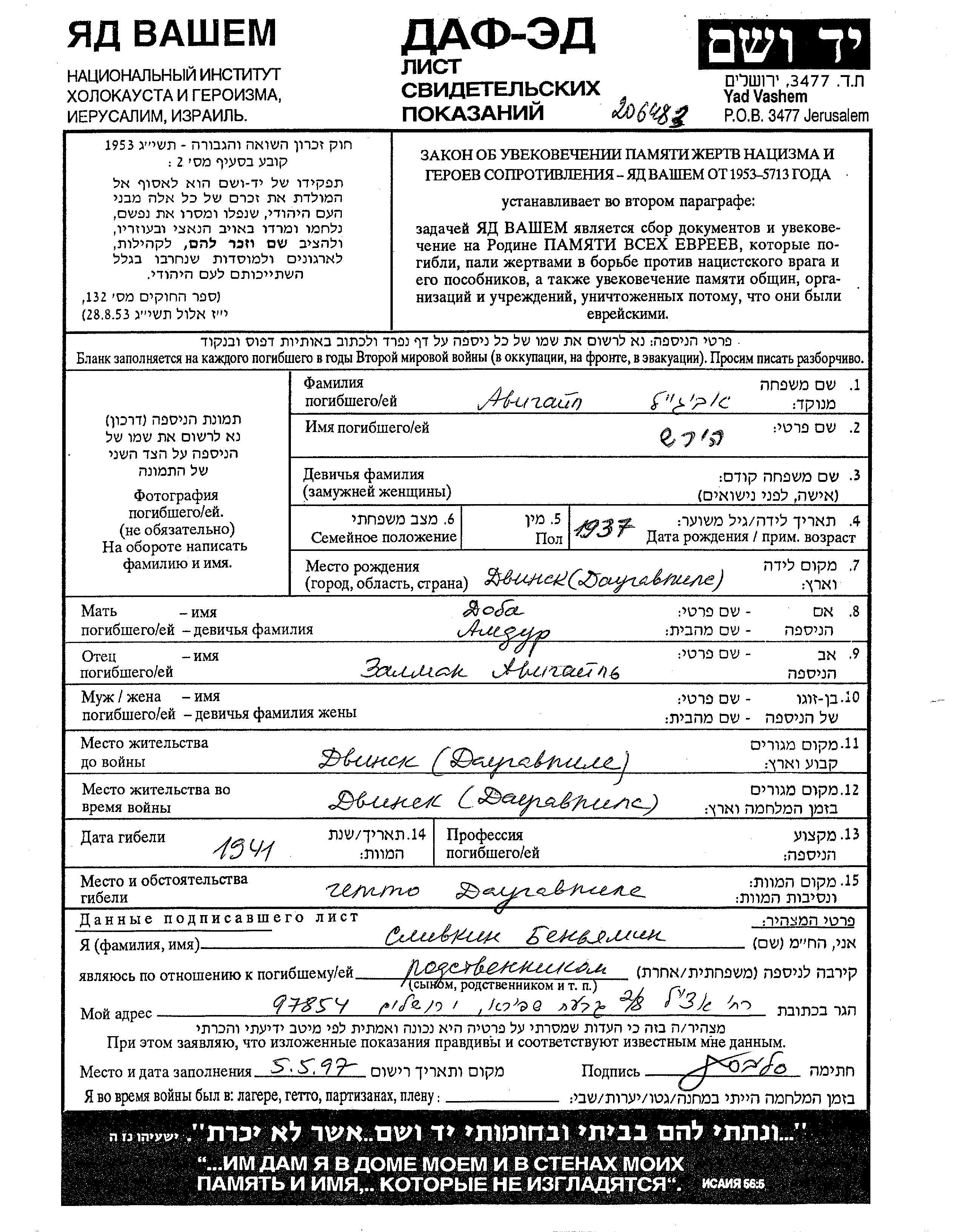 Avigail Hirsh 1937 Daugavpils, Lettonie Feuille de témoignage