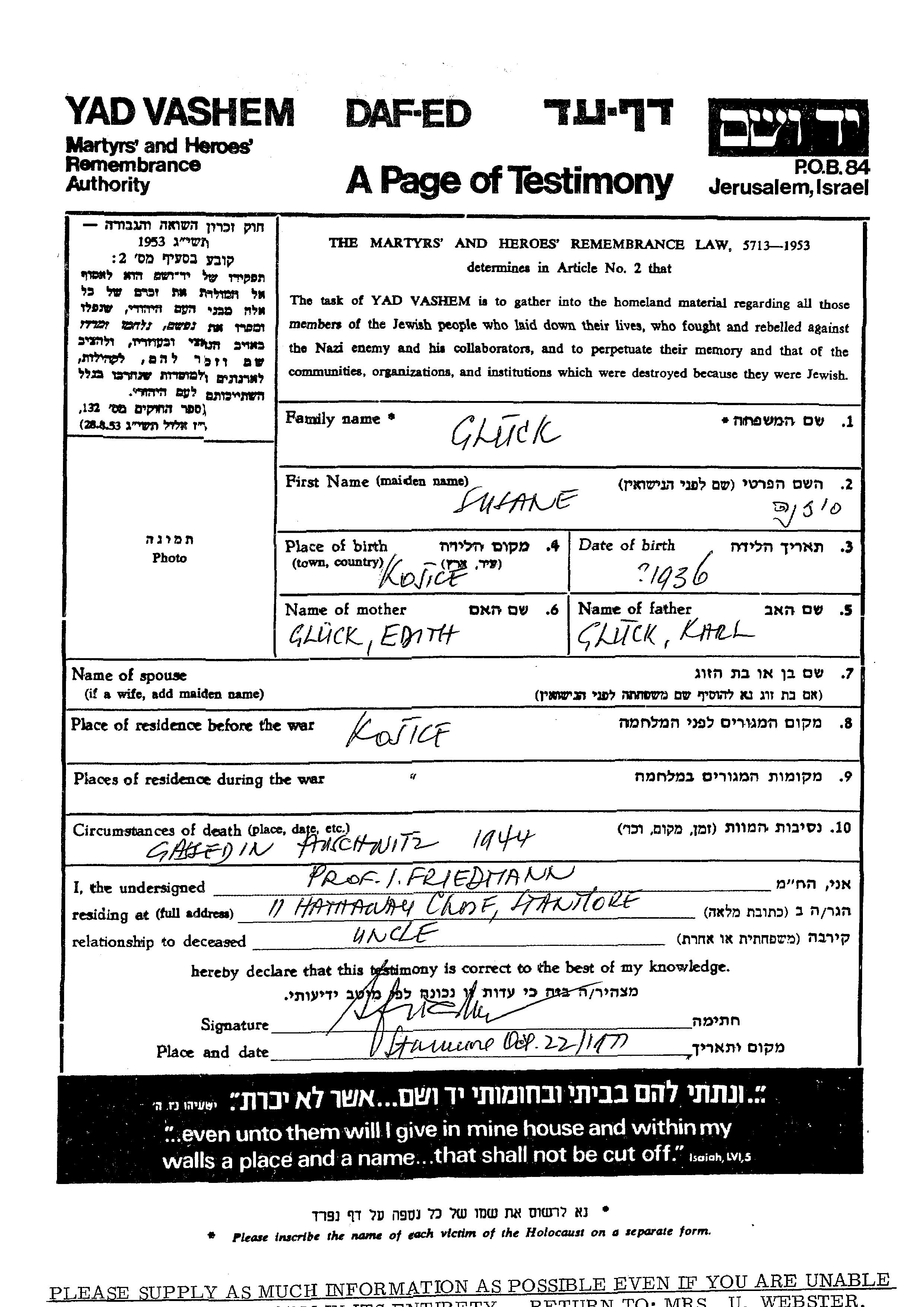 Gluck Susane 1936 Kosice, Tchécoslovaquie Feuille de témoignage