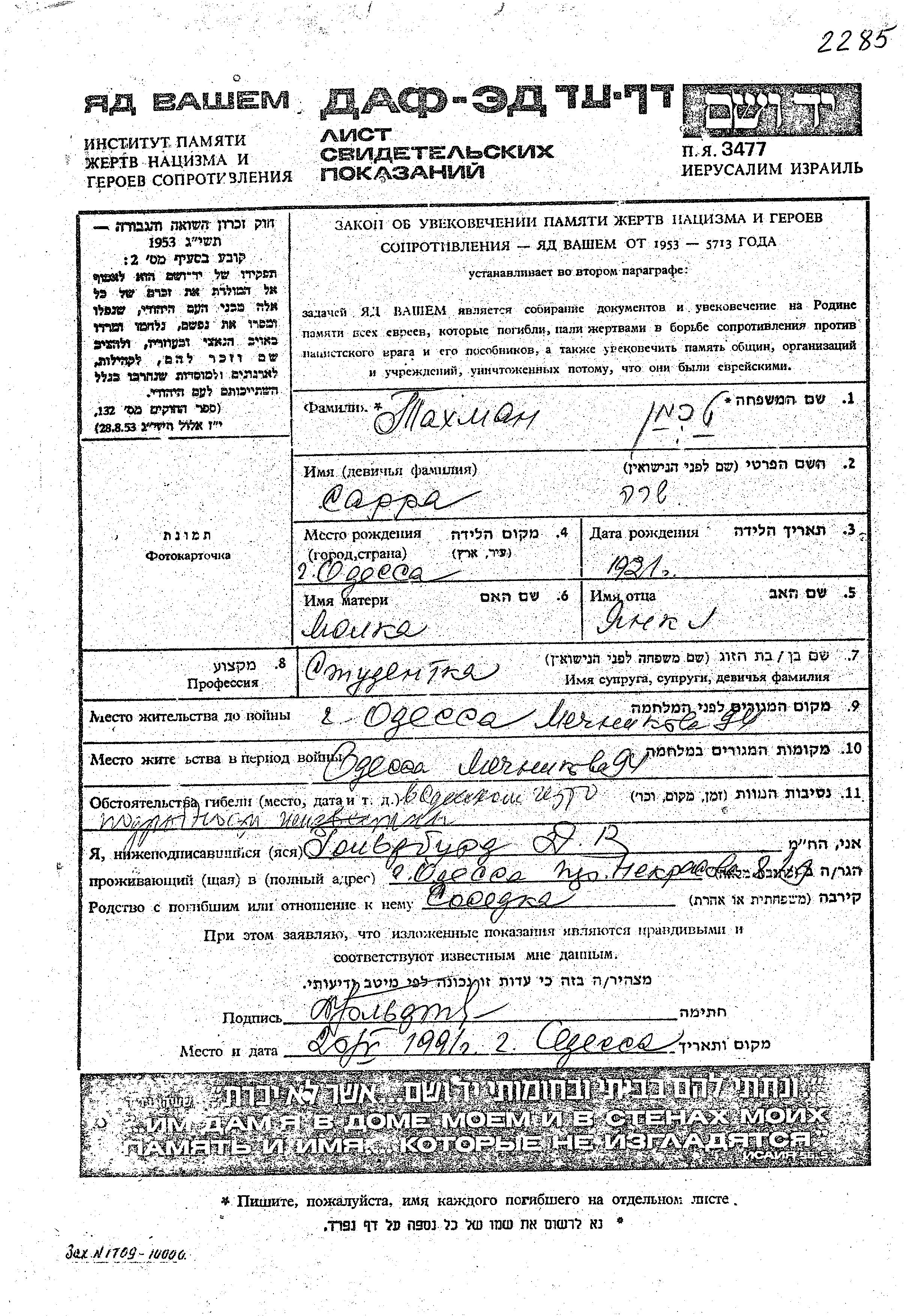 Takhman Sara 1921 Odessa, Ukraine (URSS) Feuille de témoignage