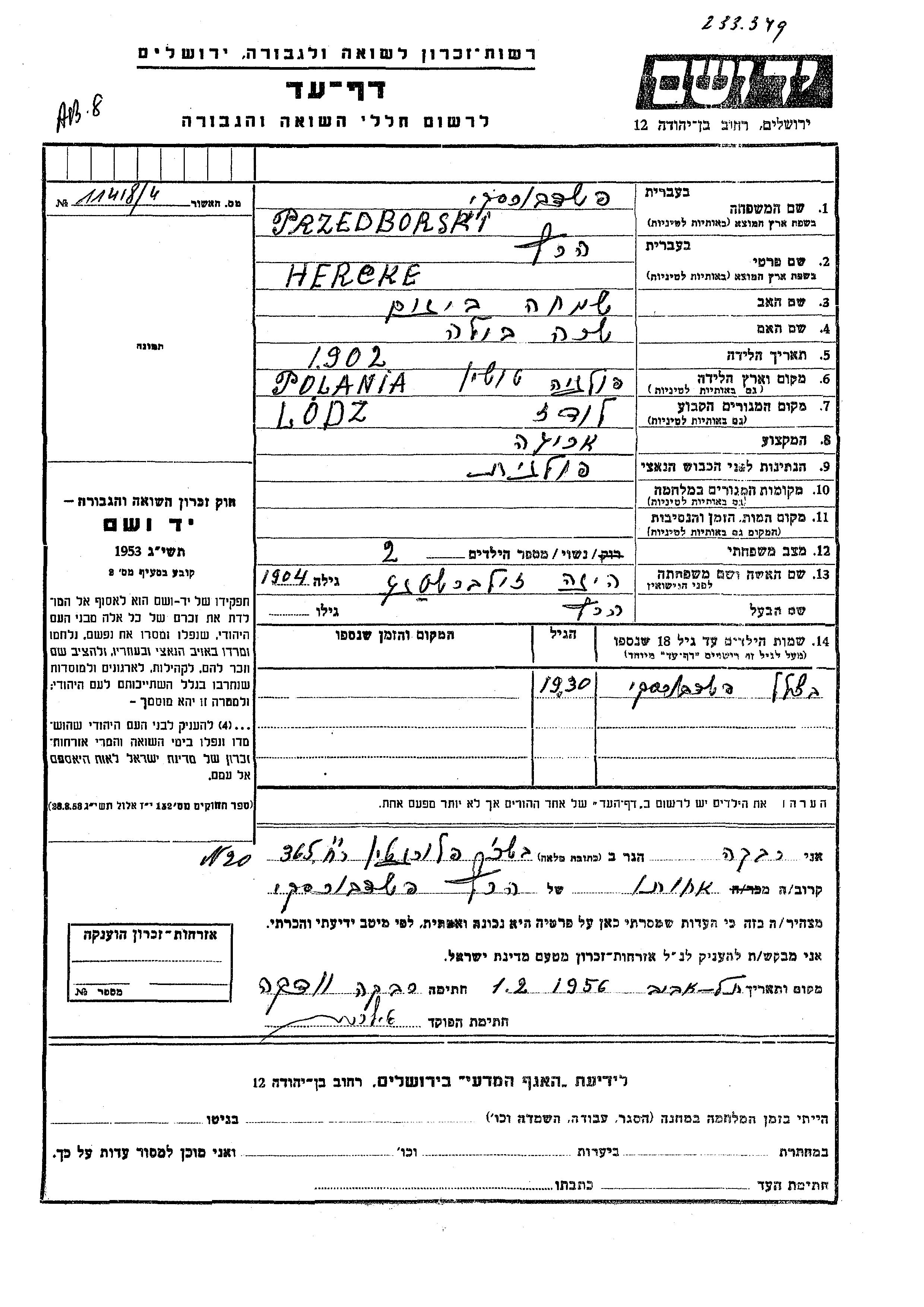 Betzalel Przedborski est né en 1930. Avant la seconde guerre mondiale il vivait à Lodz, Pologne.
