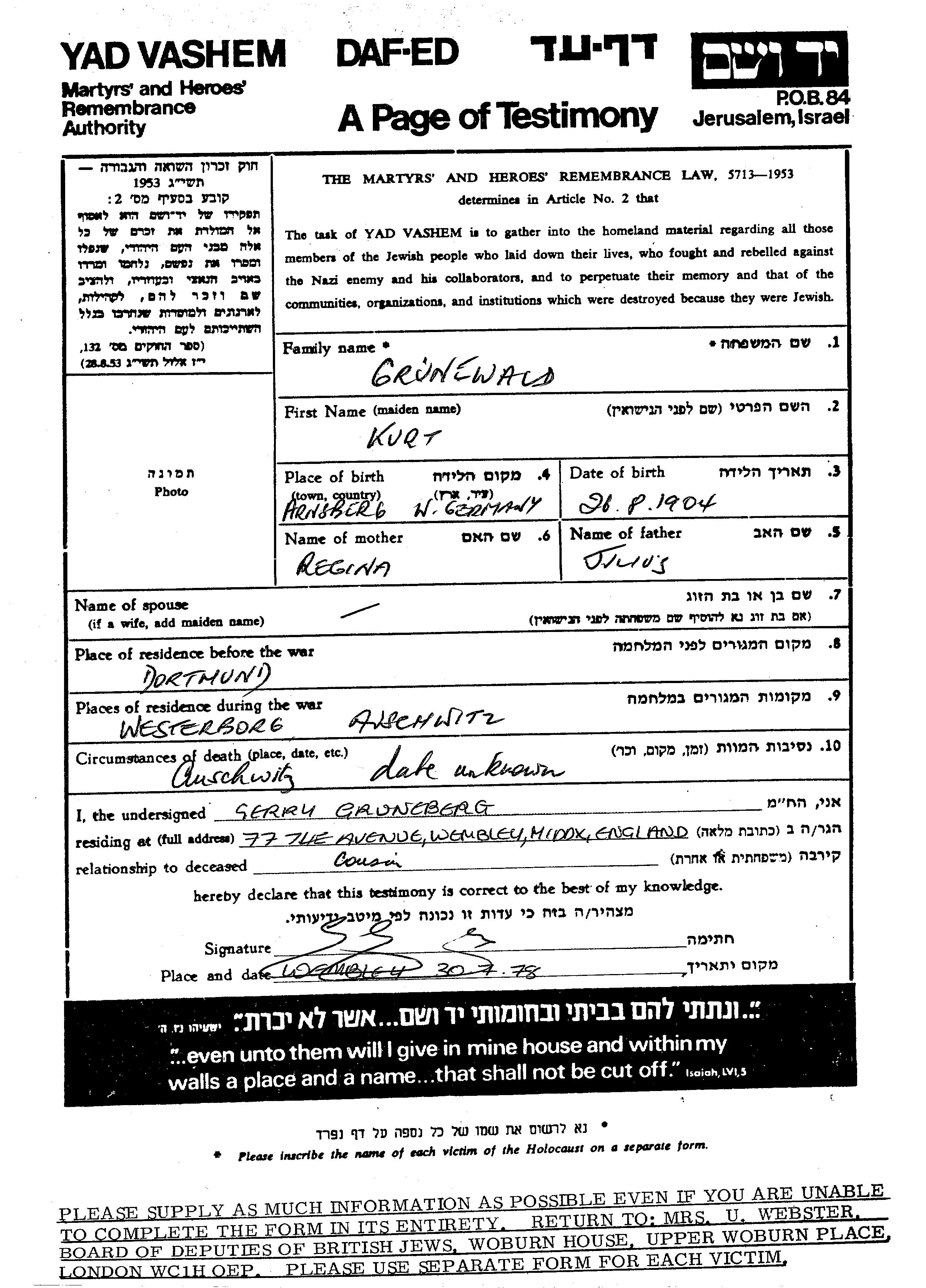 Kurt Gruenewald est né à Arnsberg, Allemagne en 1904, fils de Julius et de Regina. Avant la seconde guerre mondiale il vivait à Dortmund, Allemagne. Au cours de la guerre, il était à Westerbork, Pays Bas.
