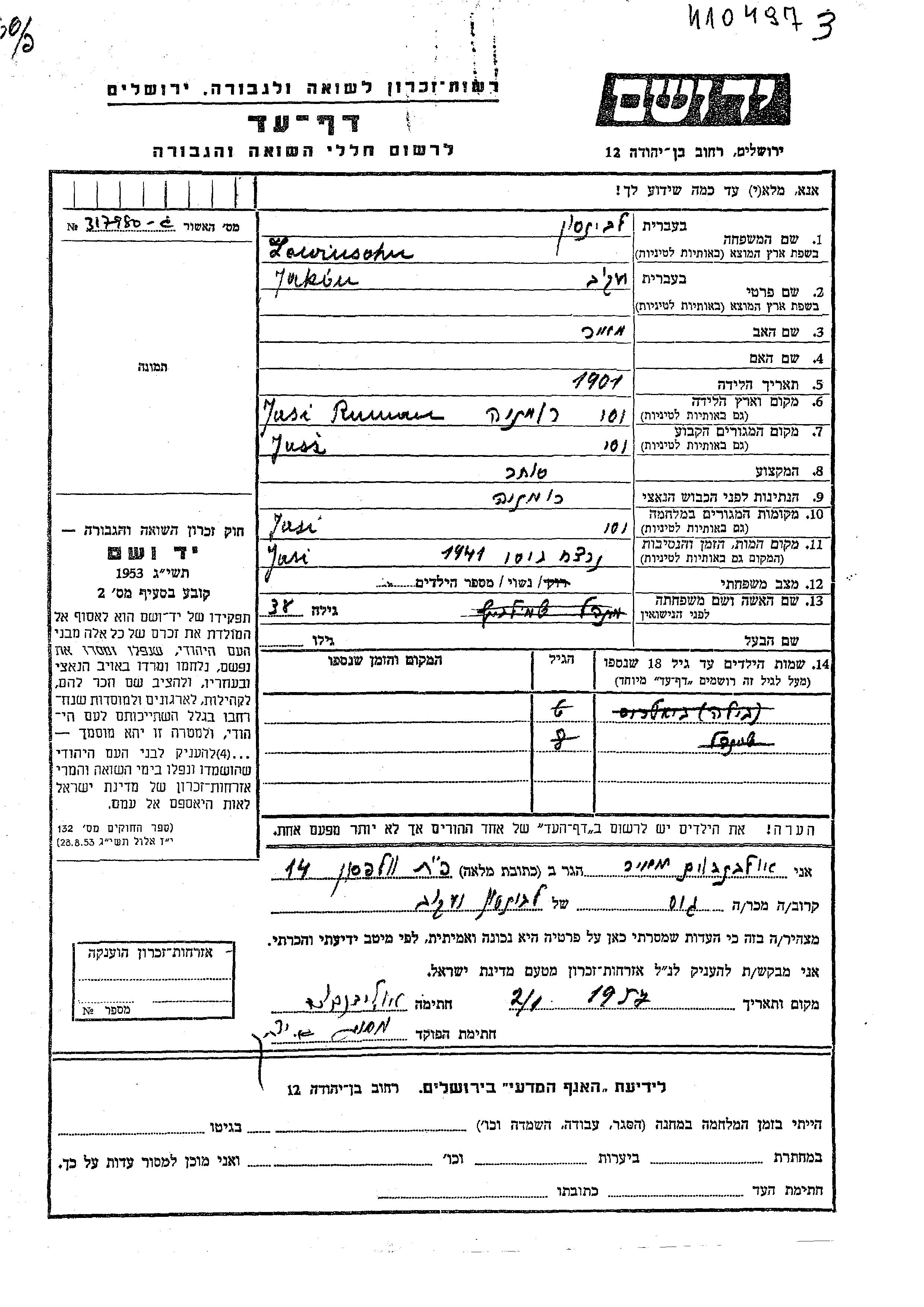 Yad Vashem - Pages of Testimony Names Memorial Collection