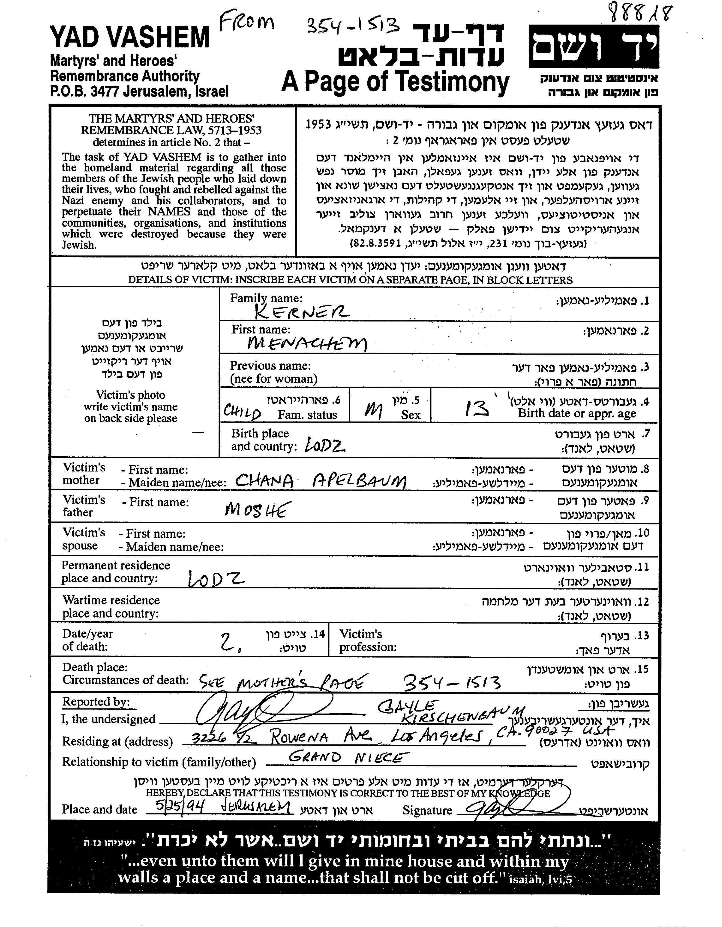 Kerner Menachem Lodz, Pologne Feuille de témoignage
