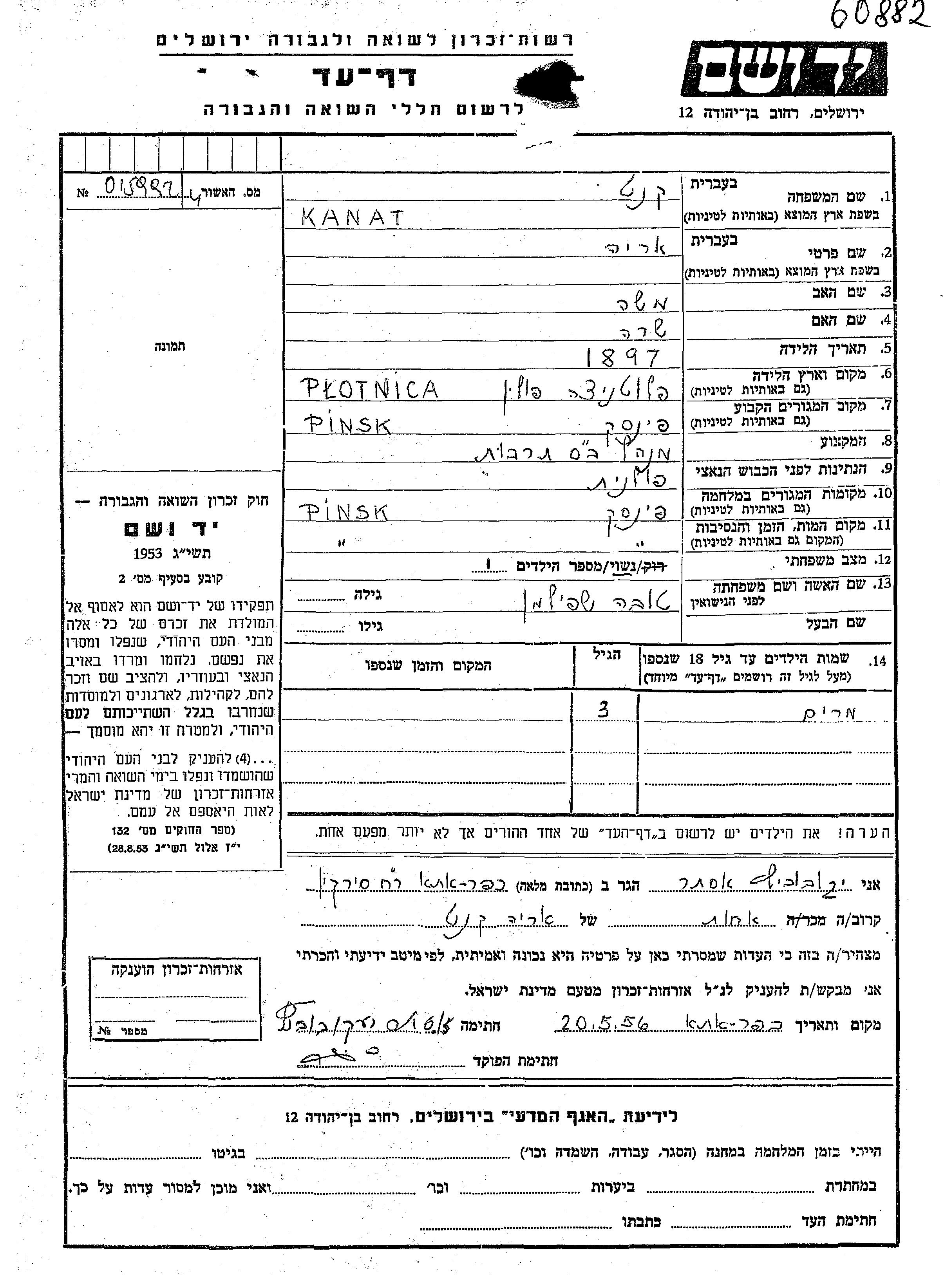 Kanat Kant Miriam 1938 Pinsk, Pologne Feuille de témoignage