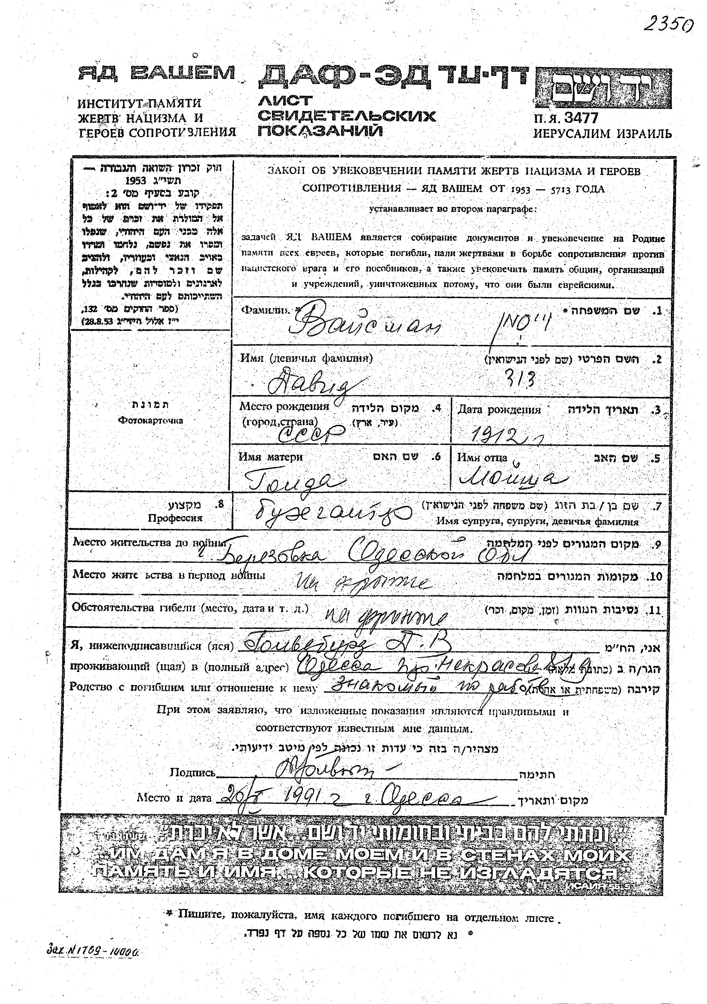 Vaisman | David | 1912 | Berezovka, Ukraine (URSS) | Feuille de témoignage |