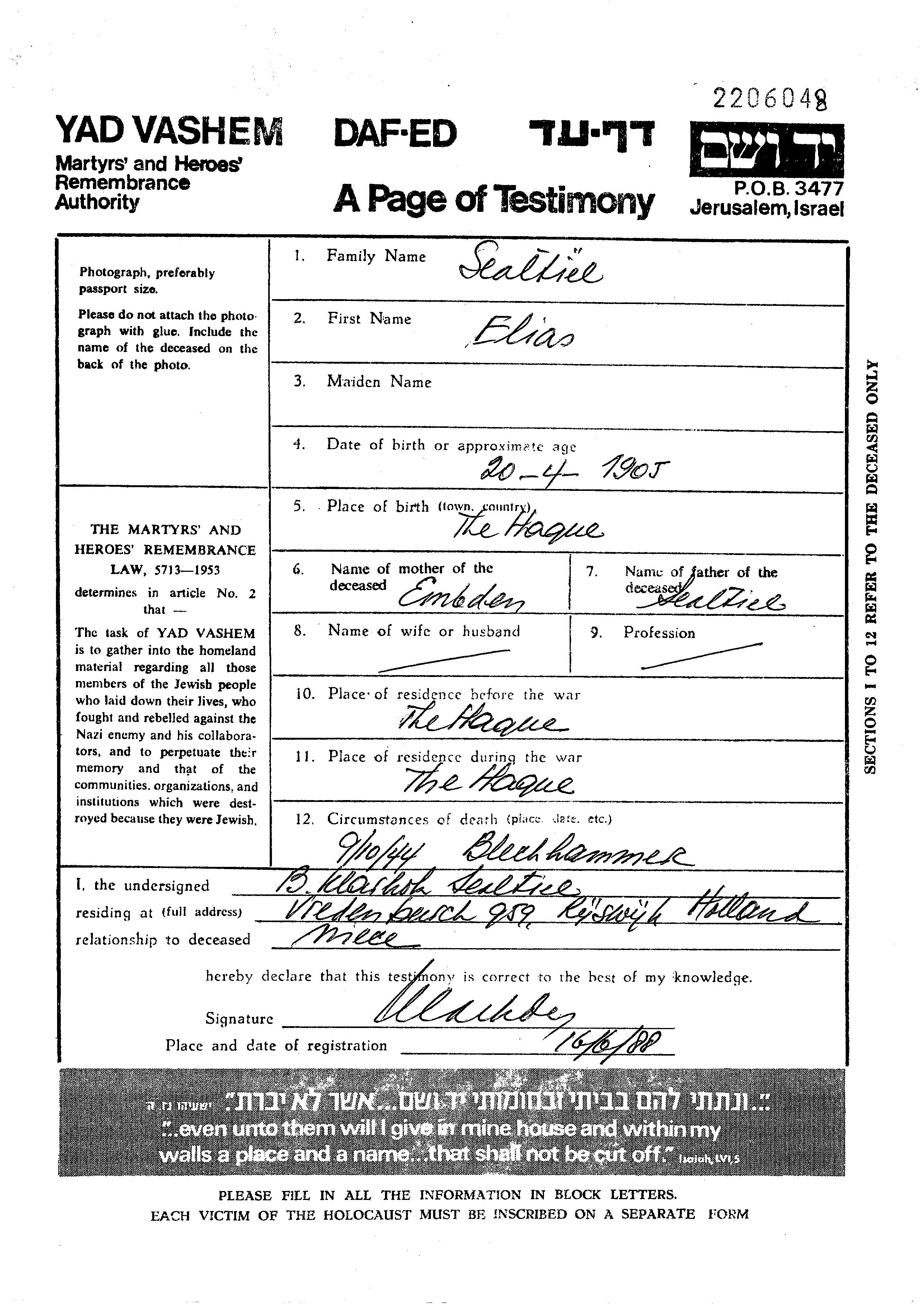 | Sealtiel | Elias | 1905 | 'S Gravenhage, Pays-Bas | Liste des Juifs des Pays-Bas assassinés |