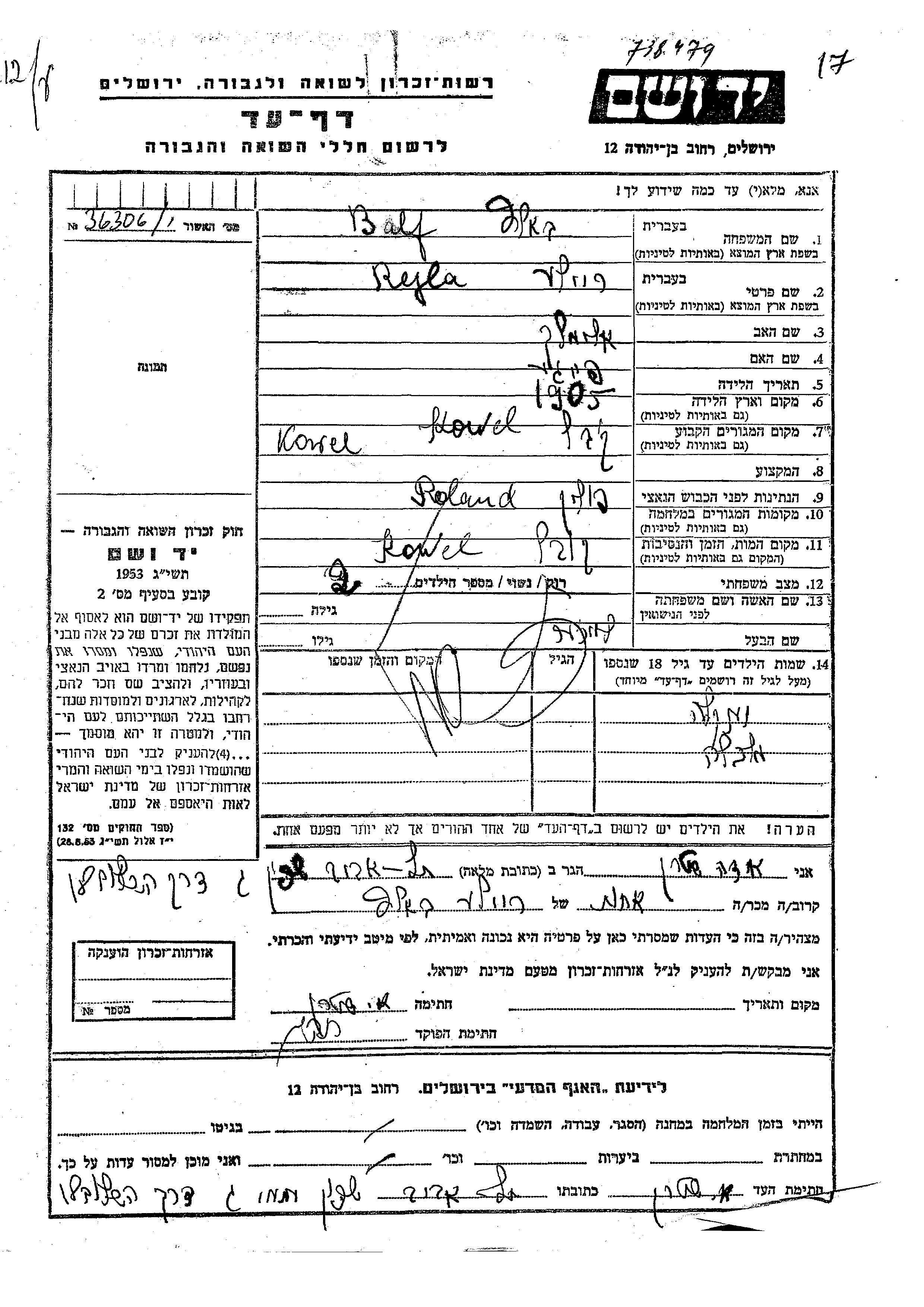 Balf Yaakov Kowel, Pologne Feuille de témoignage