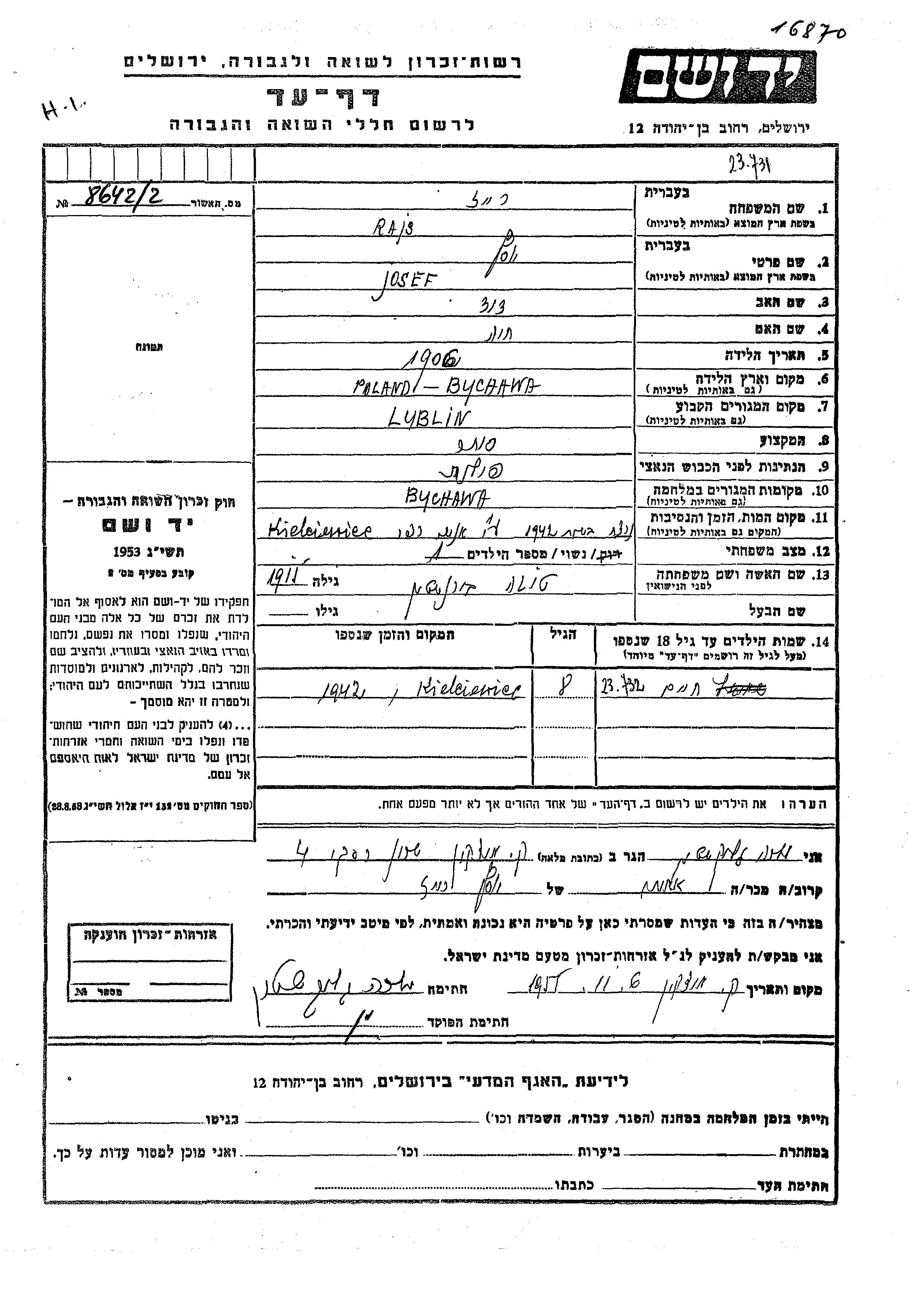 Rais Ris Khaim Lublin, Pologne Feuille de témoignage