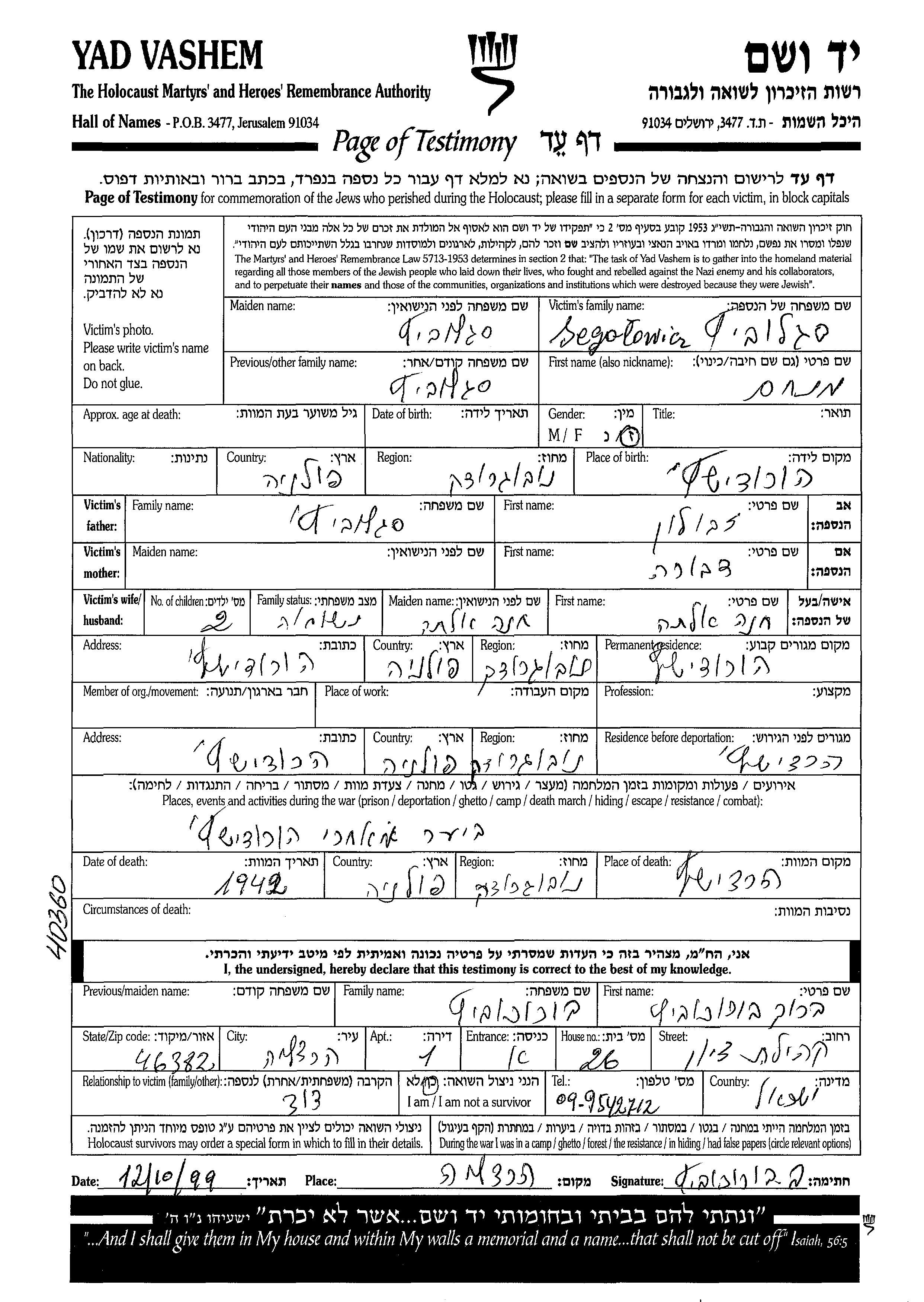 Segolowicz | Menakhem | Horodyszcze, Pologne | Feuille de témoignage | |