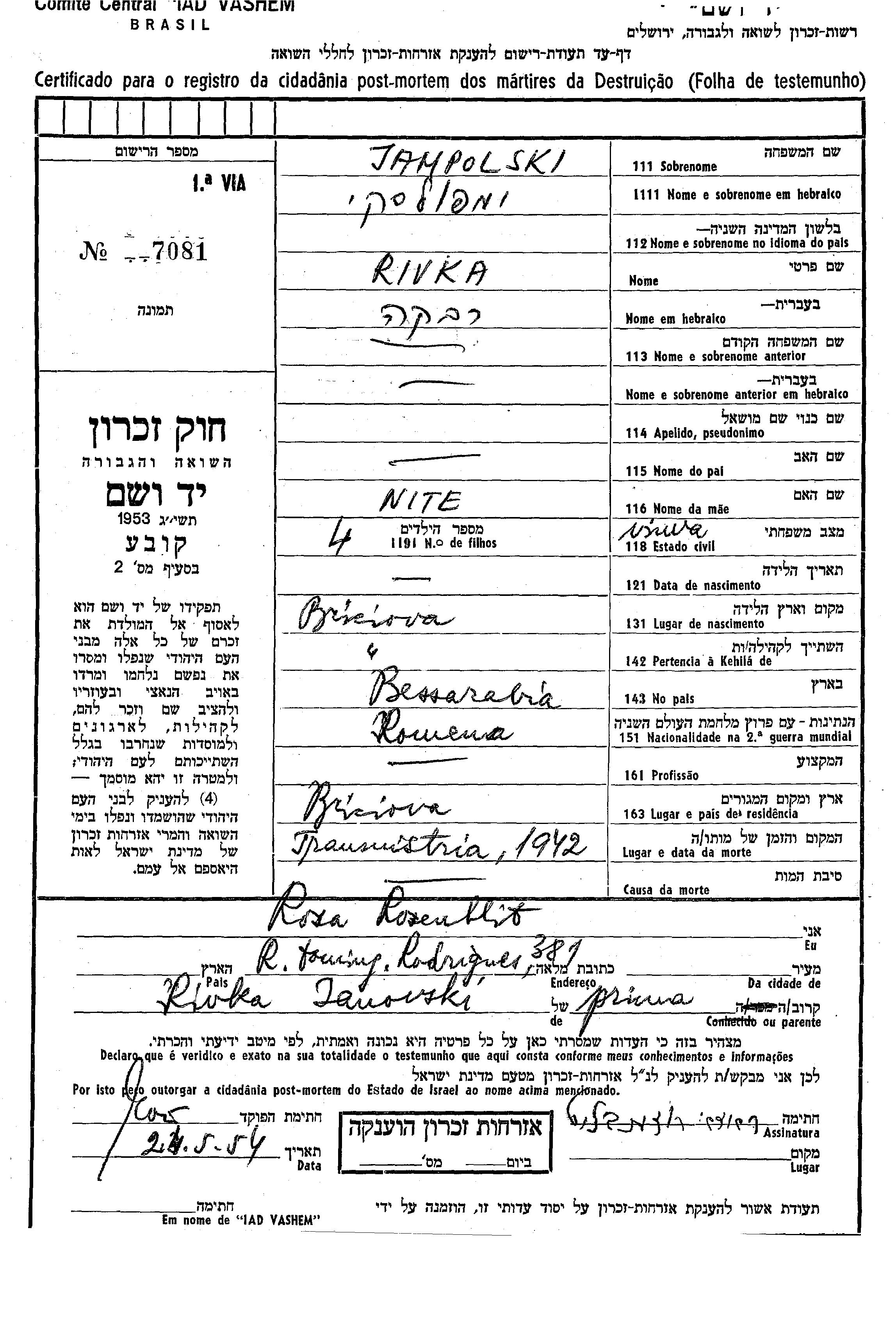 Jampolski Rivka Briciova, Roumanie Feuille de témoignage