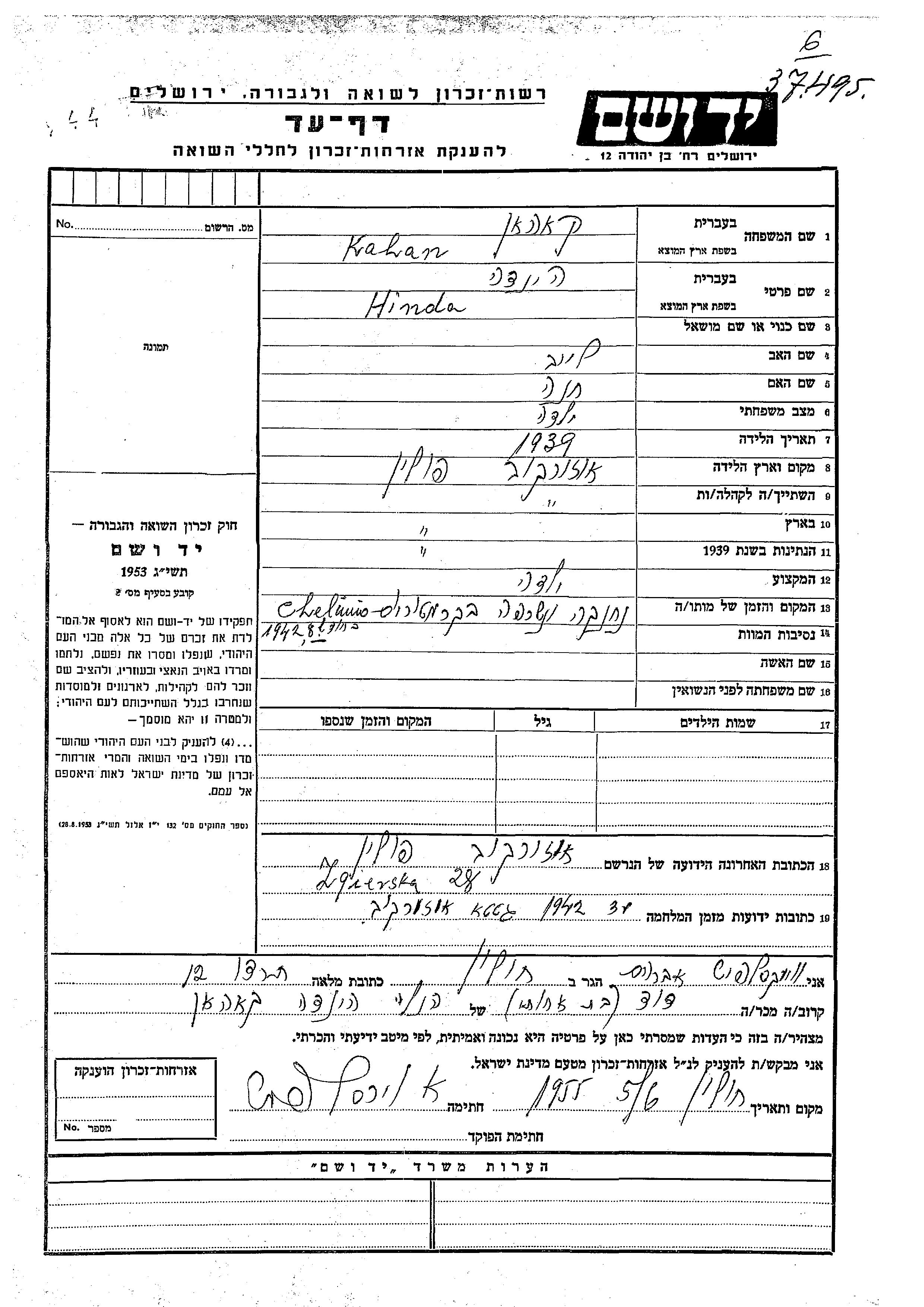 Kahan Hinda 1939 Ozorkow, Pologne Feuille de témoignage