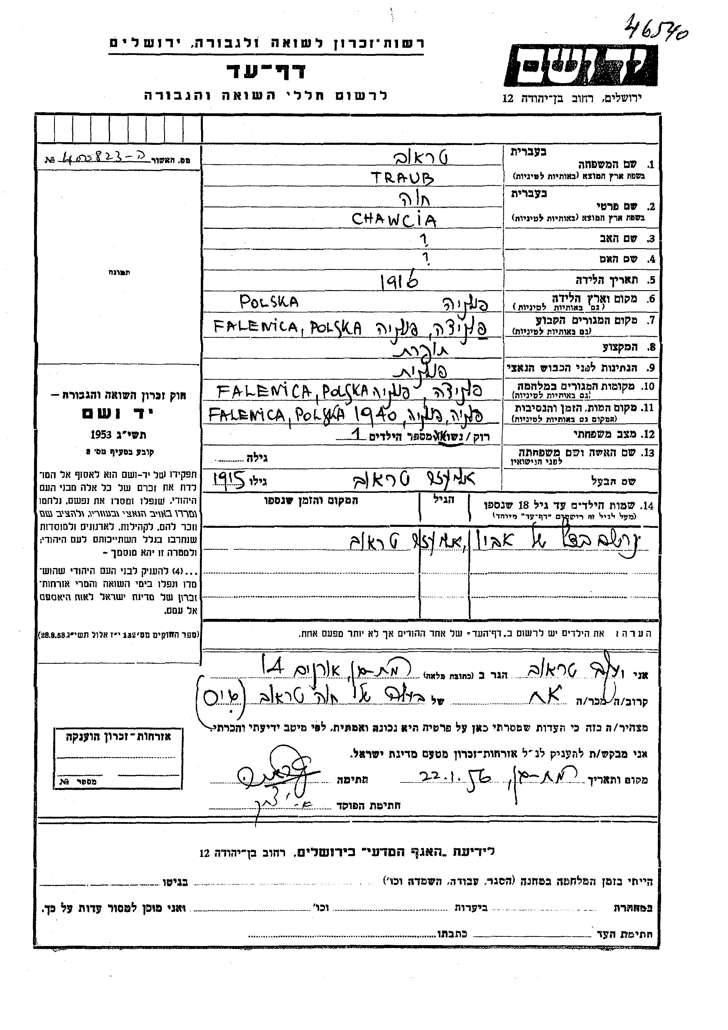 Chawcia Traub est née à Pologne en 1916. Elle était Couturière. Avant la seconde guerre mondiale elle vivait à Falenica, Pologne.