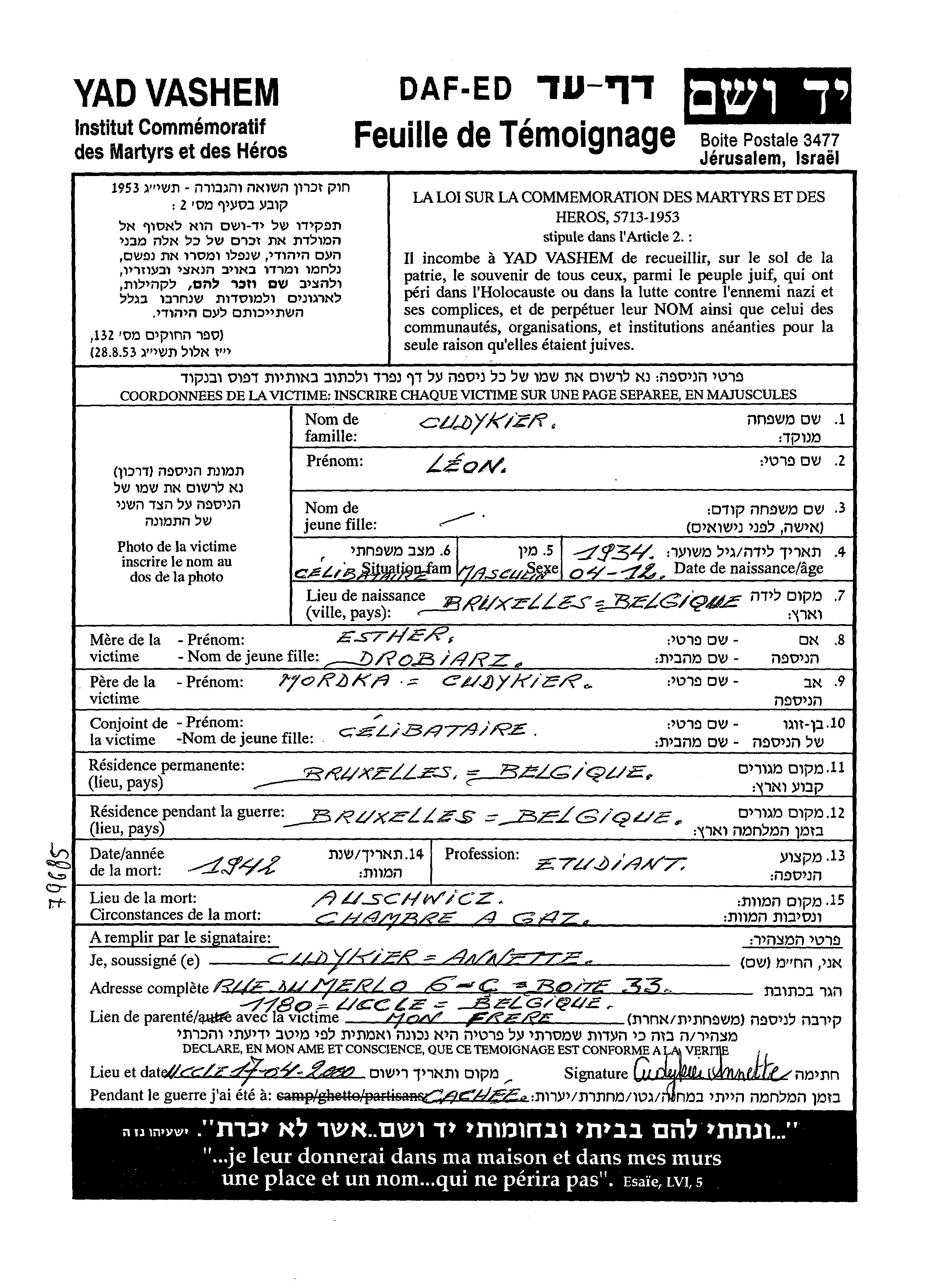 Cudykier Leon 1934 Bruxelles, Belgique Feuille de témoignage