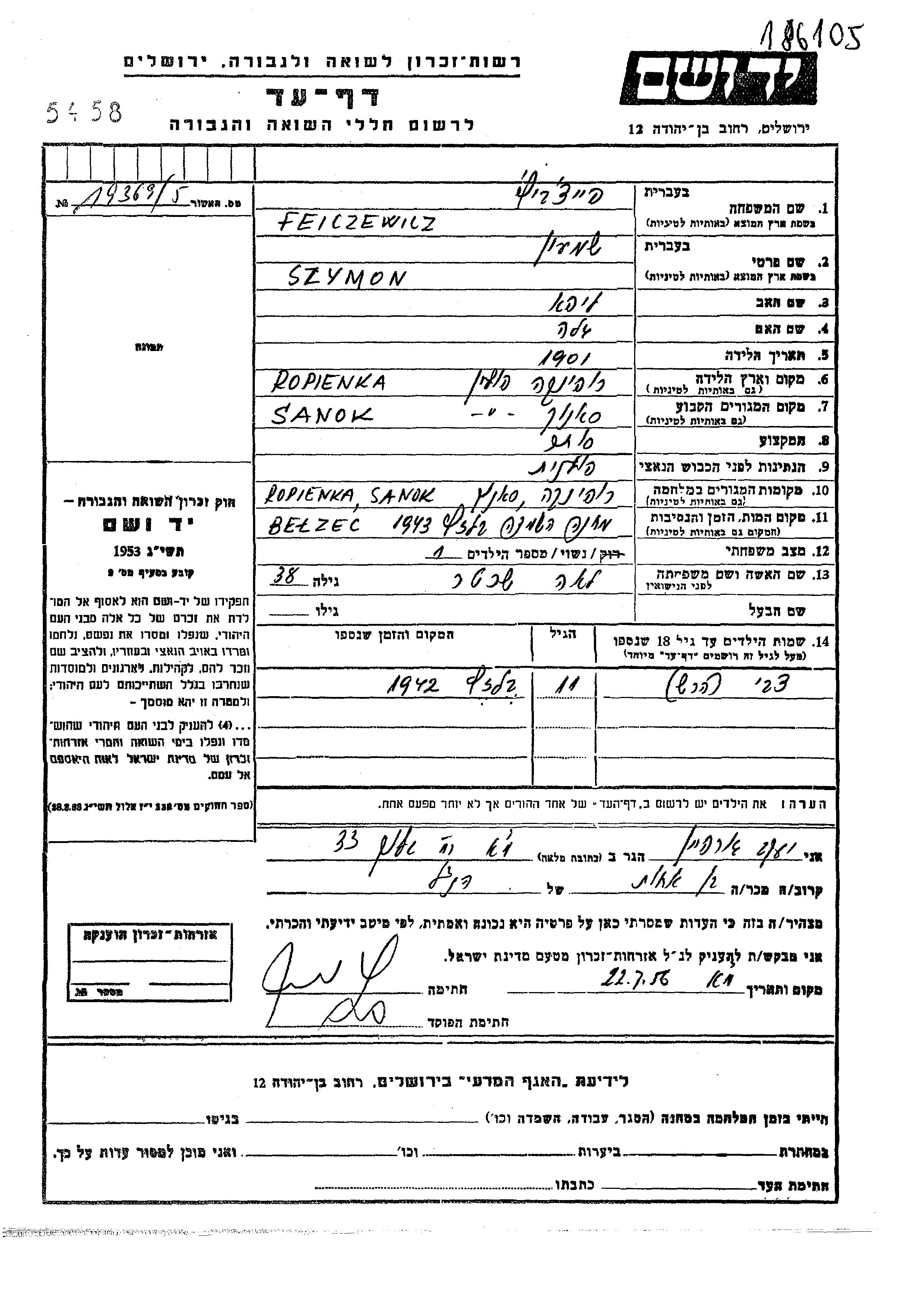 Feiczewicz Tzvi Hersh Sanok, Pologne Feuille de témoignage