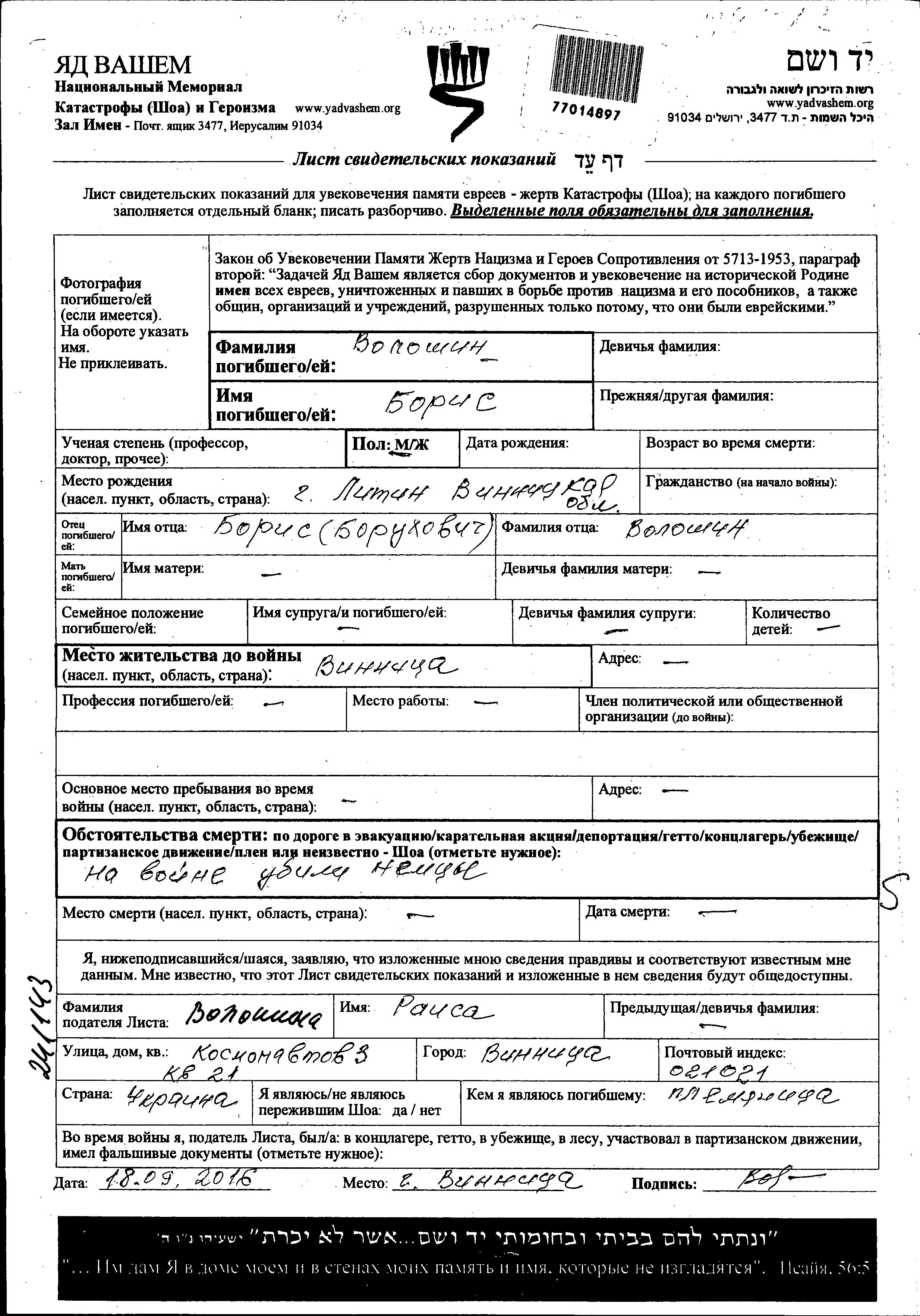 Voloshin Boris 1905 Vinnitsa, Ukraine (URSS) Feuille de témoignage