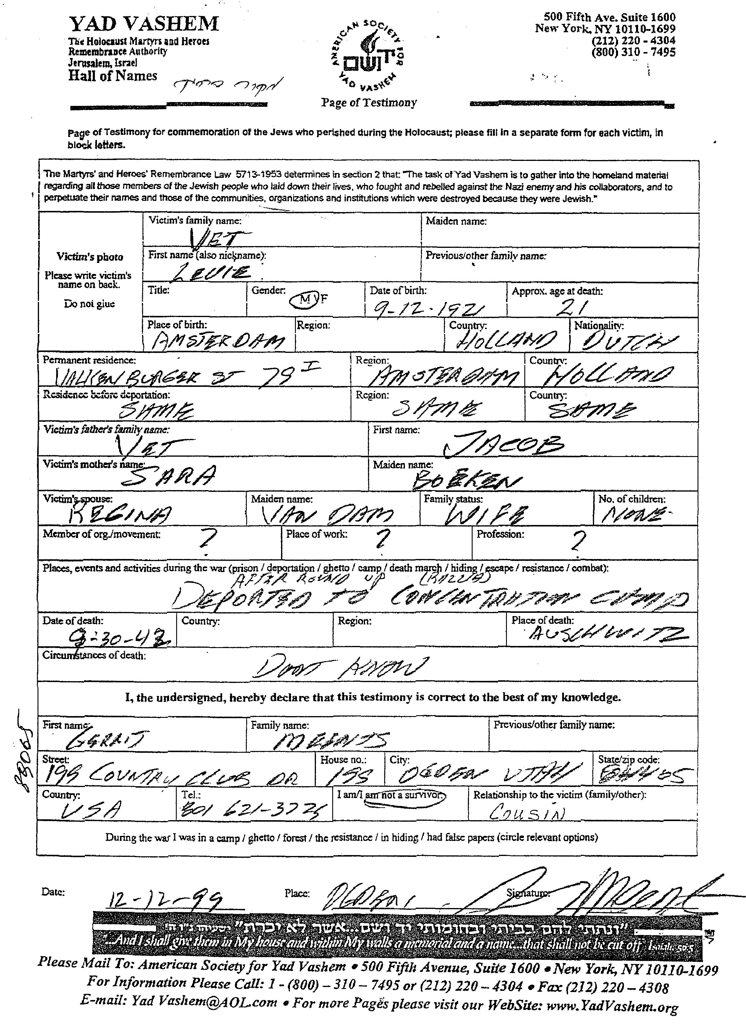 | Vet | Levie | 1921 | Amsterdam, Pays-Bas | Feuille de témoignage |