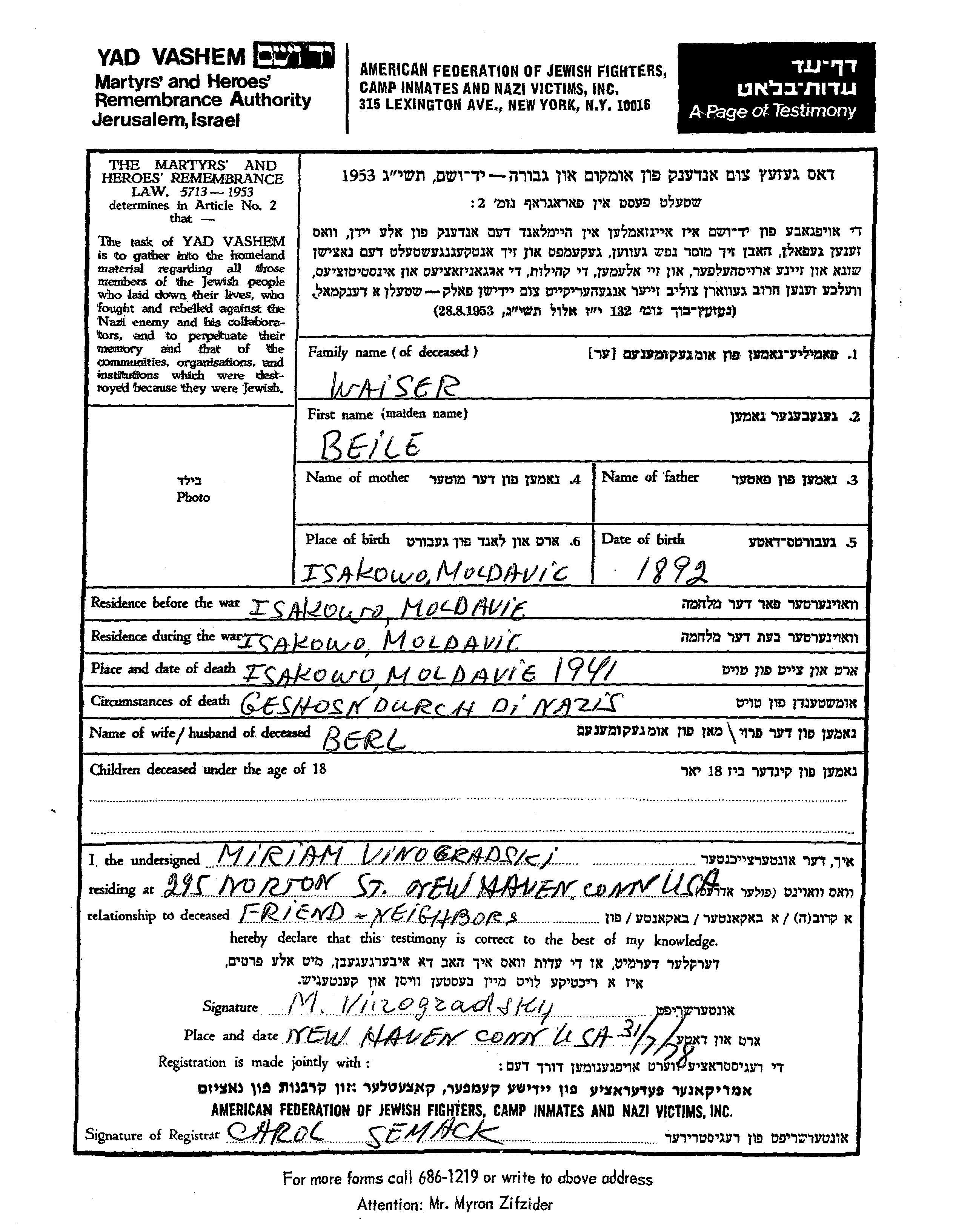 Beile a été assassinée pendant la Shoah. Lieu de la mort: Isakowo, Roumanie en 1941.
