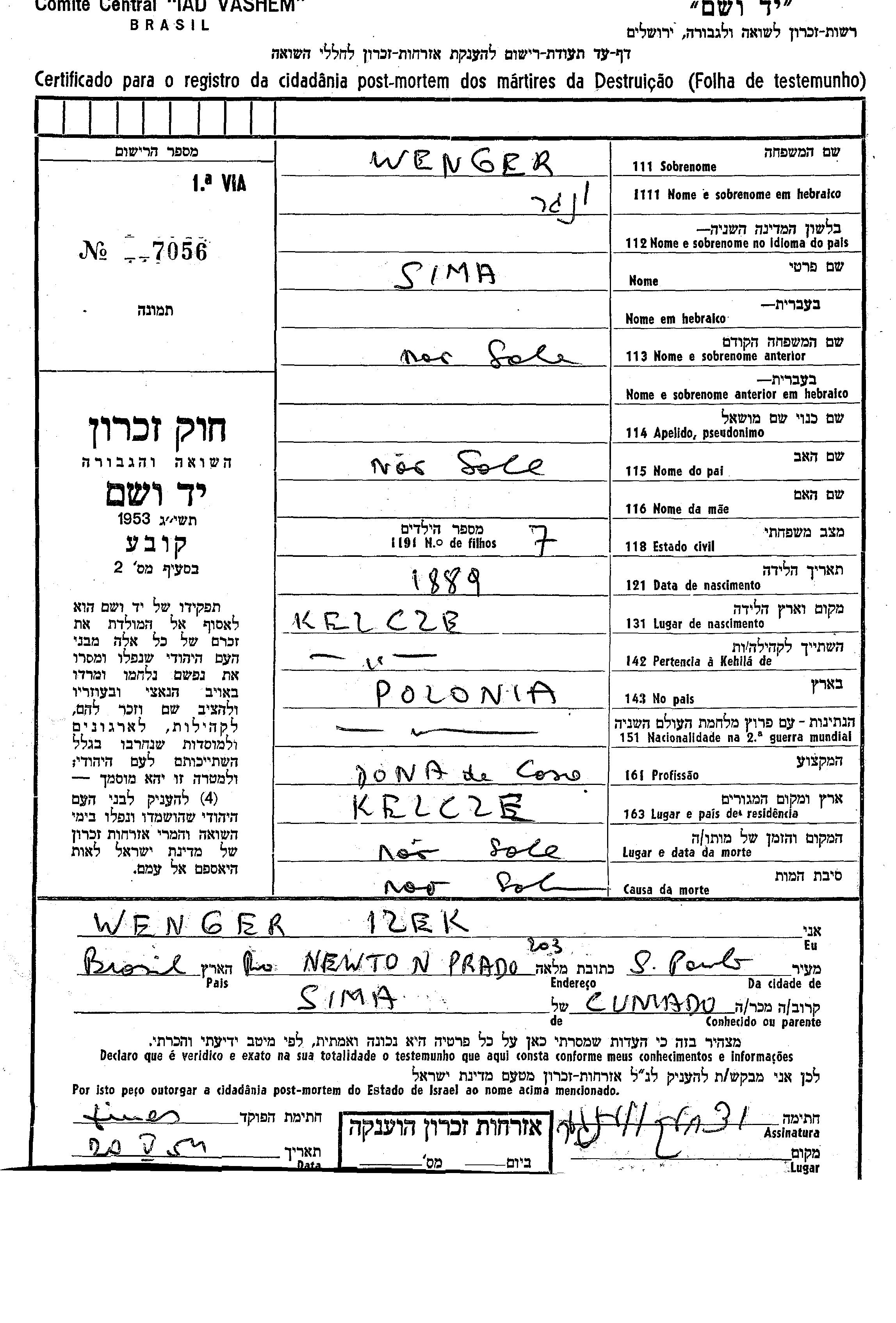 Wenger Sima 1889 Kielce, Pologne Feuille de témoignage
