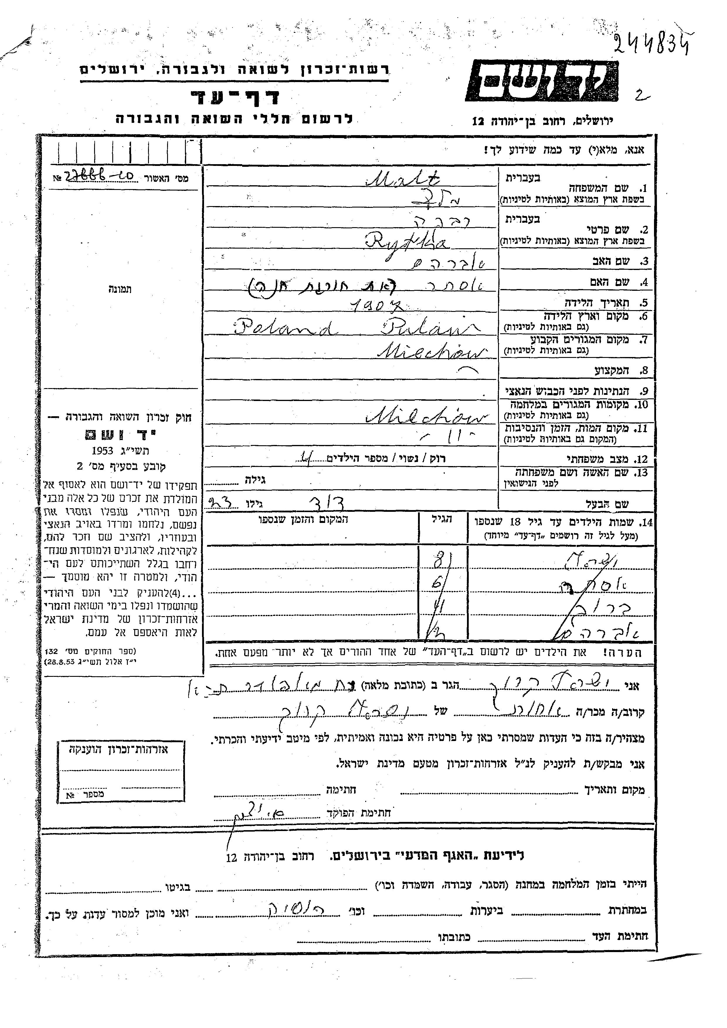 Malc | Yisrael | Miechów, Pologne | Feuille de témoignage |