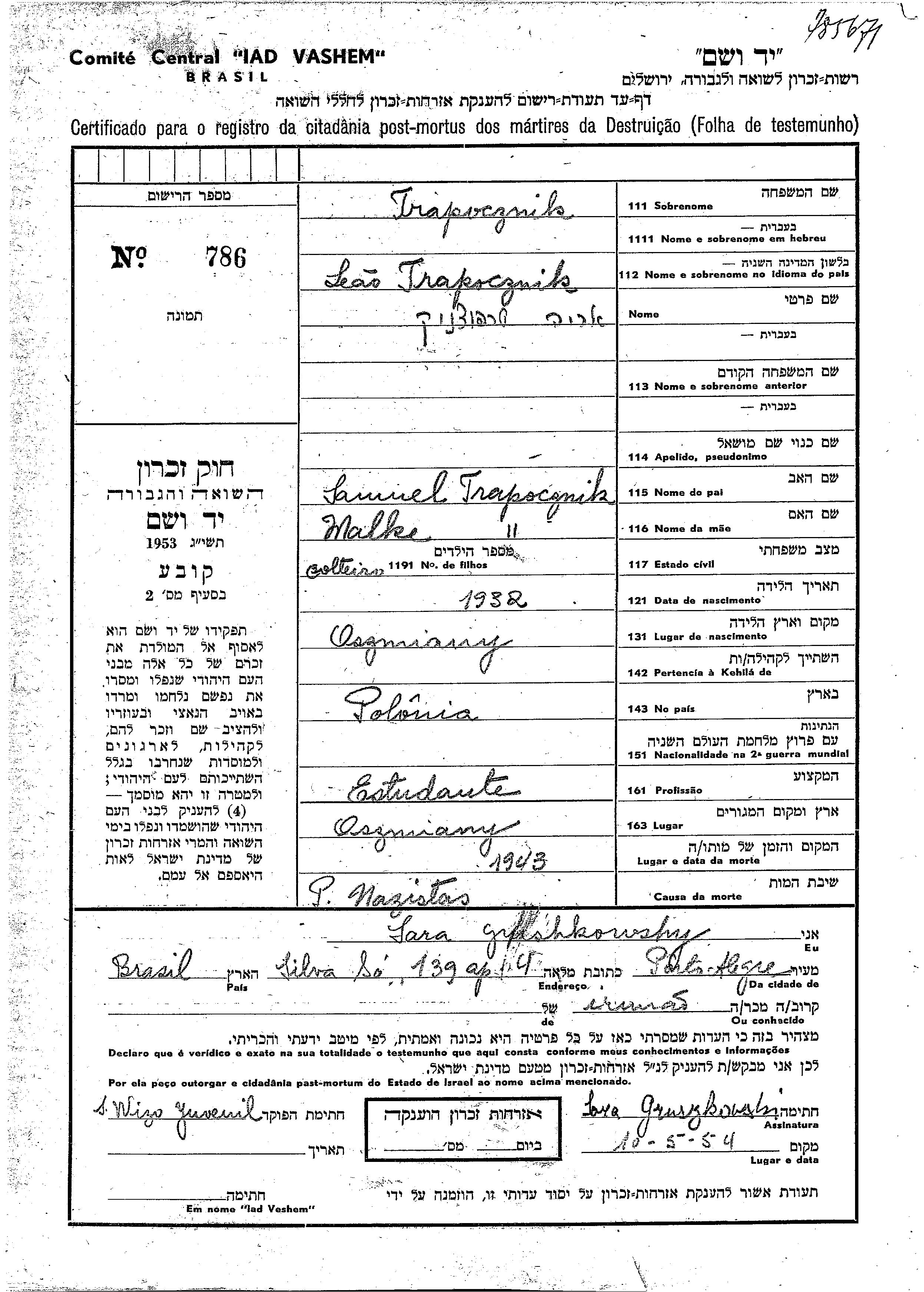 Trapocznik Leo Arie 1932 Oszmiana, Pologne Feuille de témoignage