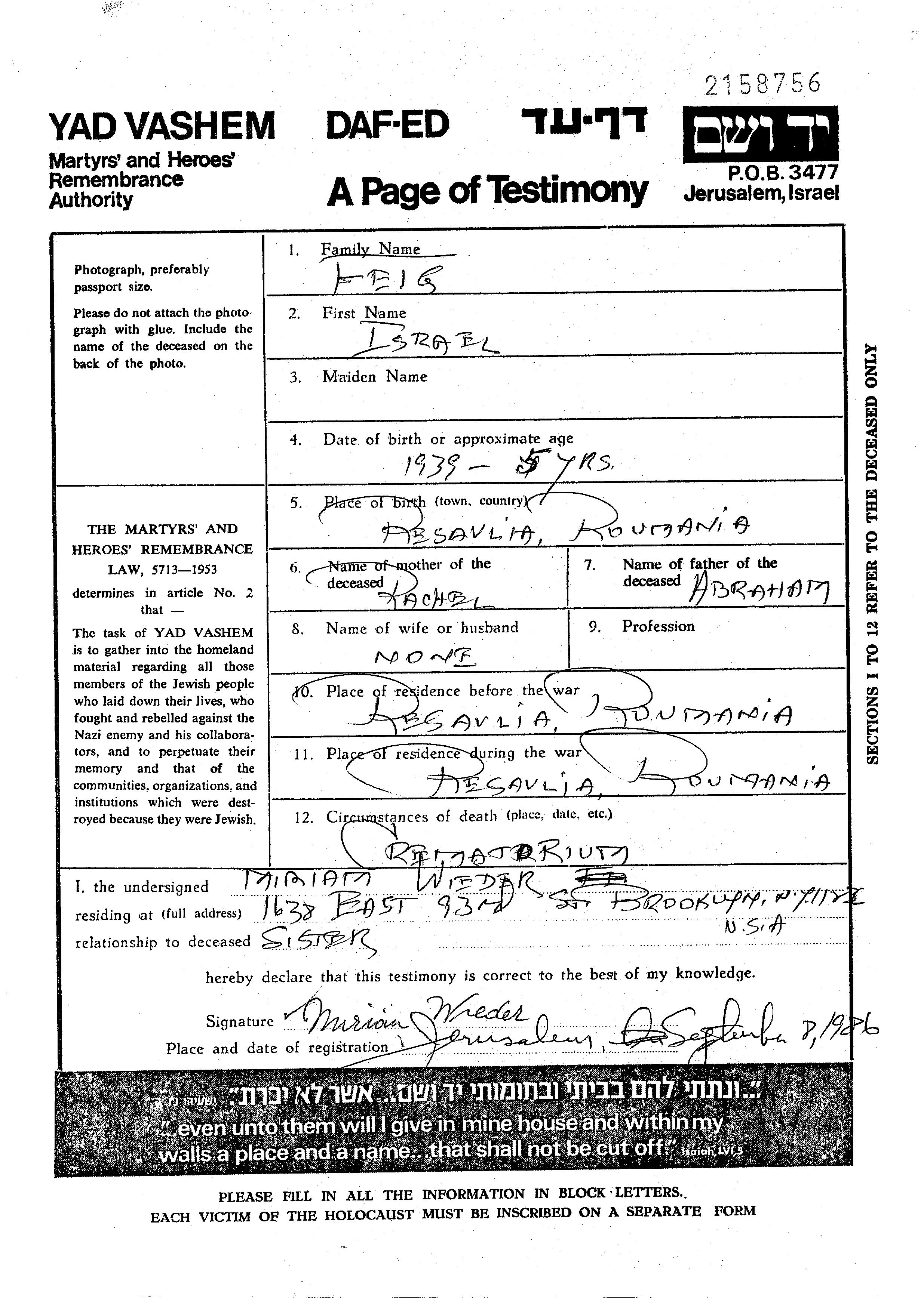 Feig Israel Razavlea, Roumanie Feuille de témoignage