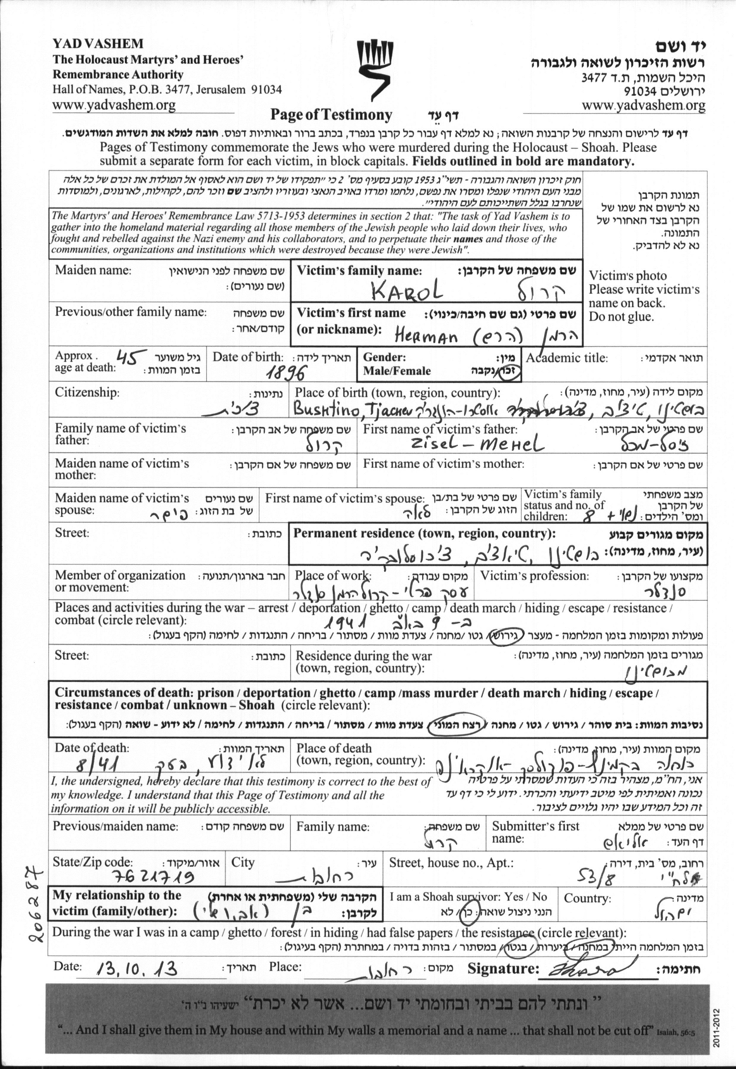 Herman Gersh Karol est né à Bustino, Tchécoslovaquie en 1896. Il était Cordonnier. Avant la seconde guerre mondiale il vivait à Bustino, Tchécoslovaquie.