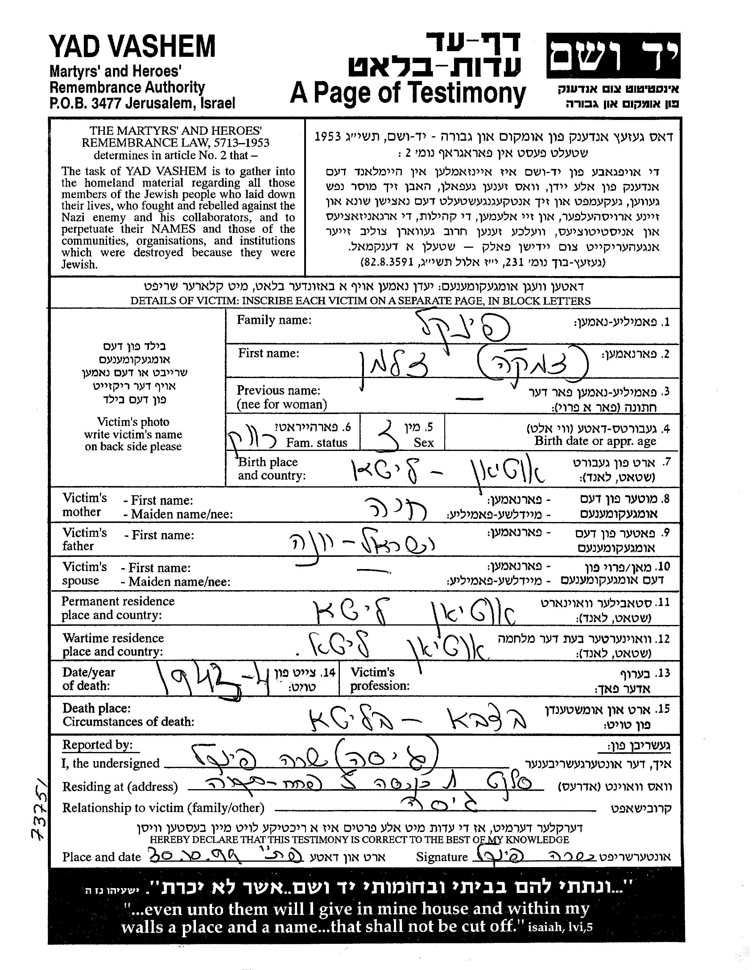 Yad Vashem - Pages of Testimony Names Memorial Collection