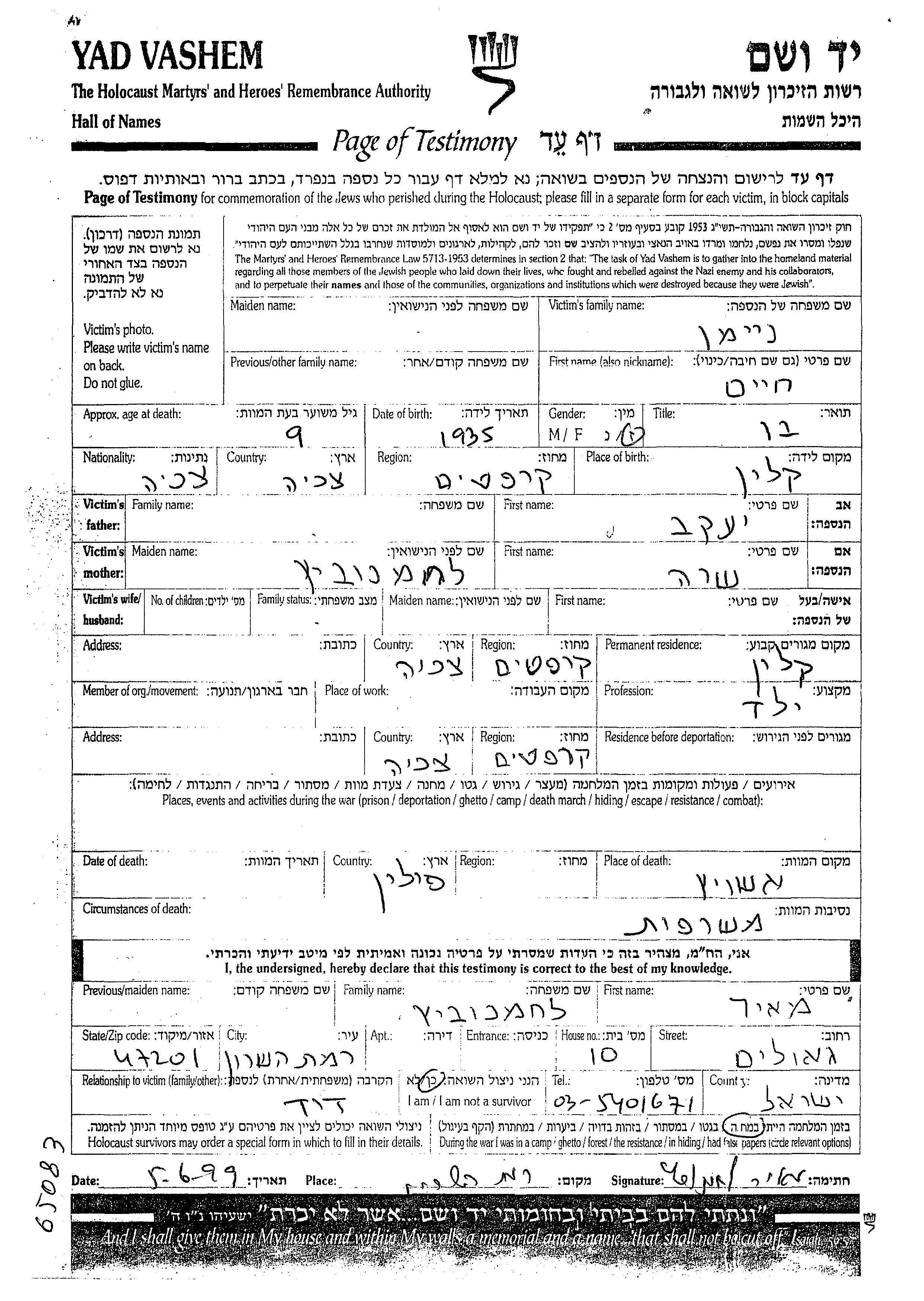 | Neiman | Khaim | 1935 | Kalin, Tchécoslovaquie | Feuille de témoignage |