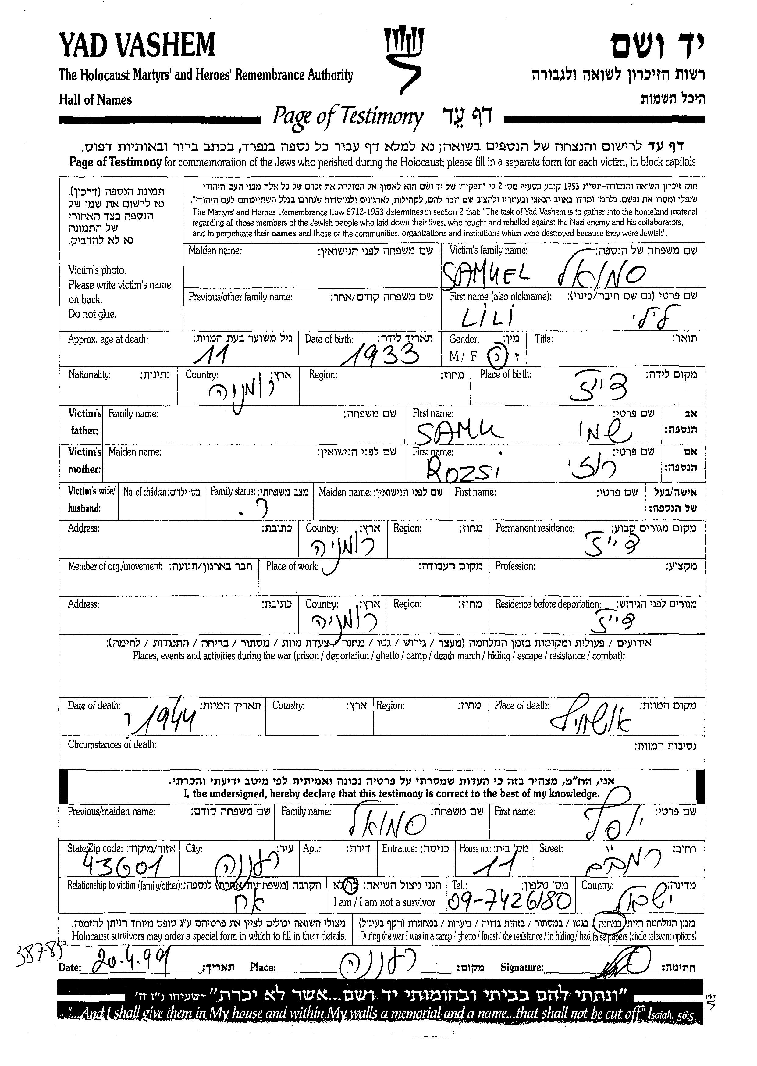Samuel Lili 1933 Dej, Roumanie Feuille de témoignage