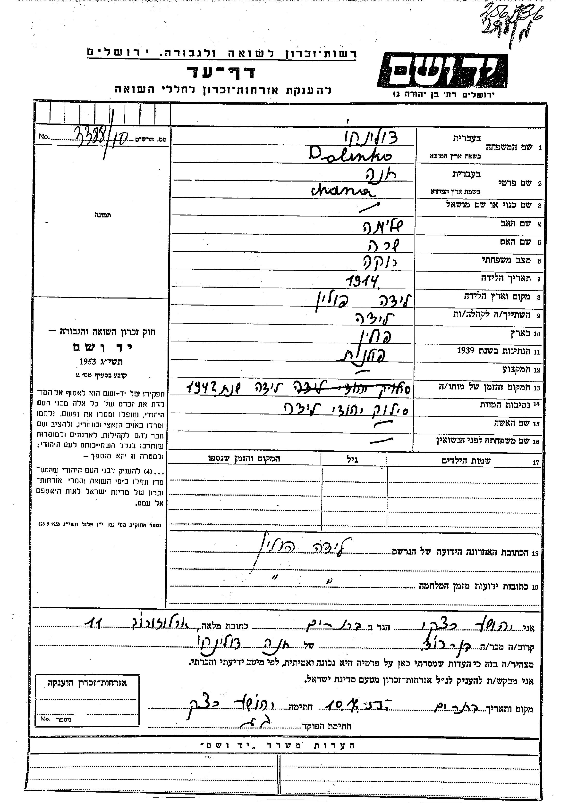 Dolinko Khana Henia Lida, Pologne Feuille de témoignage