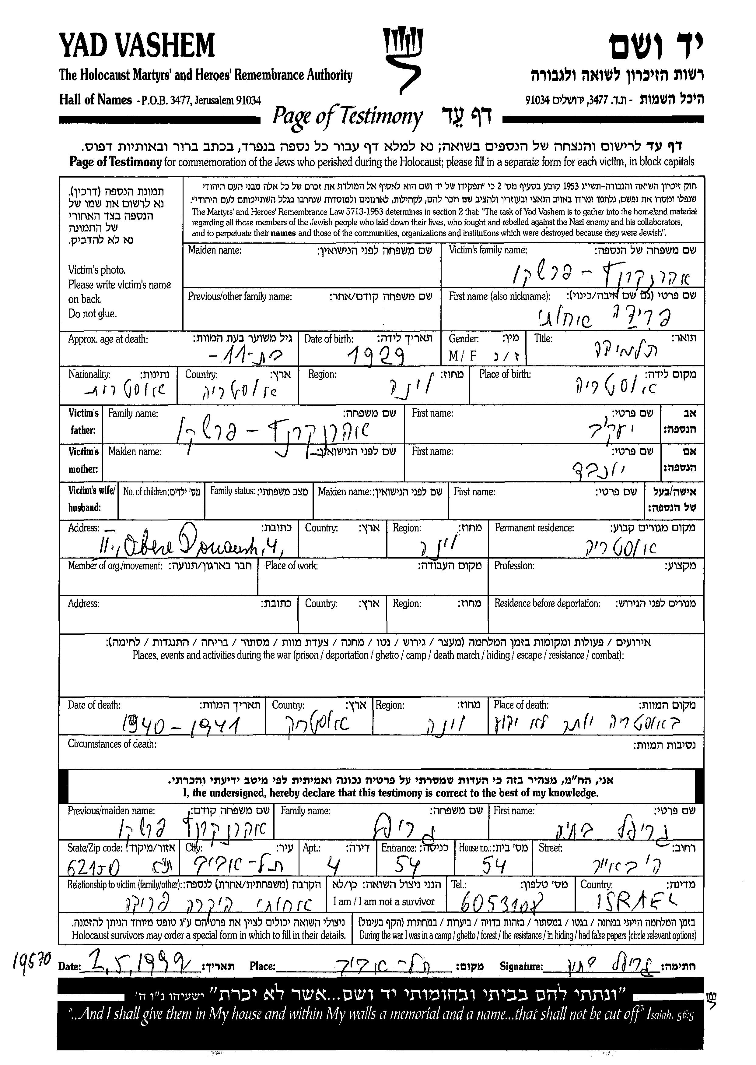 Yad Vashem - Pages of Testimony Names Memorial Collection