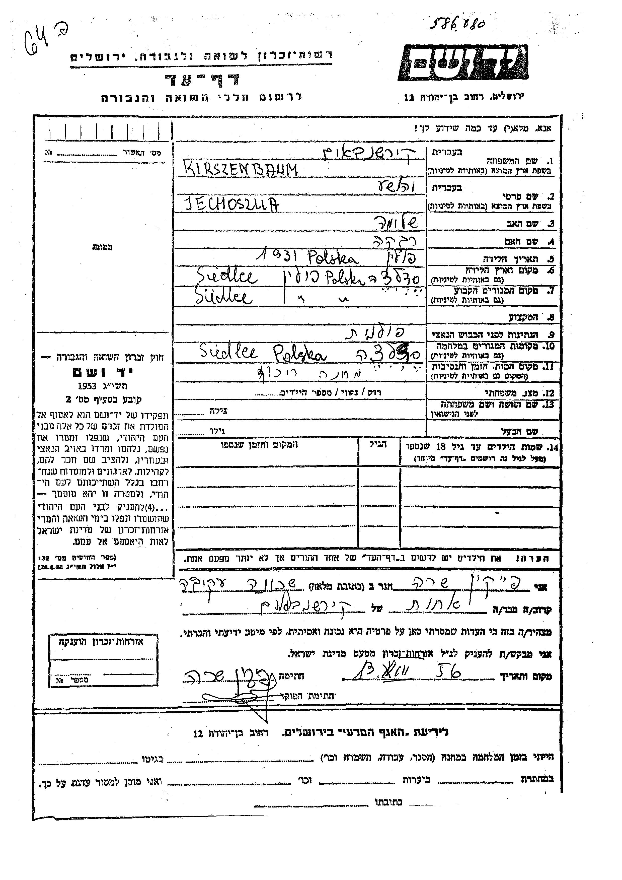 Kirszenbaum | Jechoszua | 1931 | Siedlce, Pologne | Feuille de témoignage |